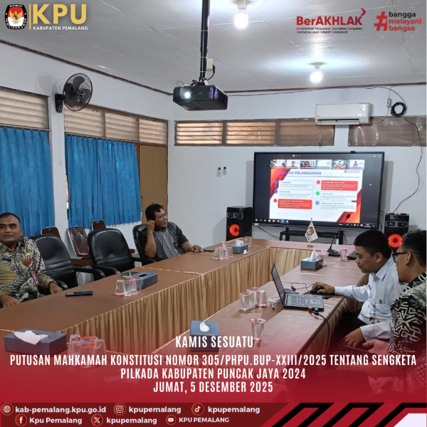 5 Desember 2025, KPU Kabupaten Pemalang mengikuti diskusi Kamis Sesuatu yang membahas Putusan Mahkamah Konstitusi Nomor 305/PHPU.BUP-XXIII/2025 tentang sengketa pilkada Kabupaten Puncak Jaya 2024. Bertindak sebagai moderator adalah Rois Alfianto (Kasubbag TPPH KPU Kota Surakarta). Sedangkan para pembicara ialah Sepo Nawipa (Kadivkumwas KPU Provinsi Papua Tengah), Yemies Wonda (Kadivkumwas KPU Puncak Jaya), dan Bambang Christanto (Kadivkumwas KPU Surakarta). Perkara yang dibahas berawal dari permohonan pasangan calon nomor urut 1, Yuni Wonda dan Mus Kogoya. Dalam kasus ini, KPU Puncak Jaya merupakan termohon. Sedangkan pihak terkait adalah paslon nomor 2, Miren Kagoya dan Mendi Wonerengga. Dalam putusannya, MK mengabulkan sebagian permohonan pemohon dengan membatalkan Keputusan KPU Puncak Jaya Nomor 476 Tahun 2024 tentang penetapan hasil pilkada. Selain itu, MK memerintahkan rekapitulasi ulang di 22 distrik.Pada 5 Desember 2025, KPU Kabupaten Pemalang mengikuti diskusi Kamis Sesuatu yang membahas Putusan Mahkamah Konstitusi Nomor 305/PHPU.BUP-XXIII/2025 tentang sengketa pilkada Kabupaten Puncak Jaya 2024. Bertindak sebagai moderator adalah Rois Alfianto (Kasubbag TPPH KPU Kota Surakarta). Sedangkan para pembicara ialah Yemies Wonda (Kadivkumwas KPU Puncak Jaya), dan Bambang Christanto (Kadivkumwas KPU Surakarta). Perkara yang dibahas berawal dari permohonan pasangan calon nomor urut 1, Yuni Wonda dan Mus Kogoya. Dalam kasus ini, KPU Puncak Jaya merupakan termohon. Sedangkan pihak terkait adalah paslon nomor 2, Miren Kagoya dan Mendi Wonerengga. Dalam putusannya, MK mengabulkan sebagian permohonan pemohon dengan membatalkan Keputusan KPU Puncak Jaya Nomor 476 Tahun 2024 tentang penetapan hasil pilkada. Selain itu, MK memerintahkan rekapitulasi ulang di 22 distrik. #TemanPemilih #KPUMelayani #KPUKabPemalang ....