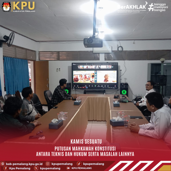 PEMALANG - KPU Kabupaten Pemalangmengikuti kegiatan Kamis Sesuatu yang diselenggarakan oleh KPU Provinsi Jawa Tengah dengan tema “Putusan Mahkamah Konstitusi antara Teknis dan Hukum serta Masalah-Masalah Lainnya”. Kegiatan ini menjadi forum kajian untuk memperdalam pemahaman terhadap implikasi putusan MK dalam penyelenggaraan Pemilu. Bertindak sebagai moderator adalah Rizki Veriyanti. Acara dibuka dengan pengantar dari Basmar Perianto Amron (KPU Provinsi Jawa Tengah). Sedangkan para pembicara adalah Hepriyadi (advokat) dan Yusuf Agung Purnama (advokat). Melalui diskusi tersebut, KPU Kabupaten Blora memperoleh penguatan perspektif baik dari sisi teknis maupun hukum, termasuk berbagai permasalahan yang kerap muncul dalam implementasinya. Pemahaman ini diharapkan dapat mendukung pelaksanaan tugas kelembagaan yang profesional, taat regulasi, dan berintegritas. #kpupemalang #pemalang #KPUMelayani #kamissesuatu ....