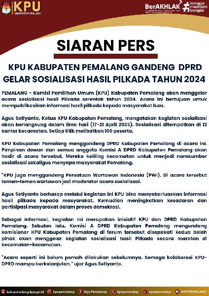 Siaran Pers KPU Kabupaten Gandeng DPRD Pemalang Sosialisasi Hasil Pilkada Pemalang Tahun 2024 Rabu, 16 April 2025 16:55 138 Berikut ini Siaran Pers KPU Kabupaten Pemalang Gandeng DPRD Pemalang Sosialisasi Gandeng DPRD Pemalang Sosialisasi Hasil Pilkada Pemalang Tahun 2024 Selengkapnya.klik disini Baca Selengkapnya