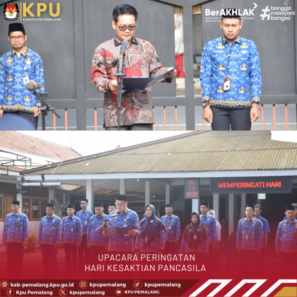 Pemalang- Rabu, 1 Oktober 2025 – Komisi Pemilihan Umum (KPU) Kabupaten Pemalang menyelenggarakan Upacara dalam rangka memperingati Hari Kesaktian Pancasila Tahun 2025. Kegiatan ini dilaksanakan di halaman Kantor KPU Kabupaten Pemalang dan diikuti oleh seluruh Anggota KPU serta jajaran Sekretariat KPU Kabupaten Pemalang.