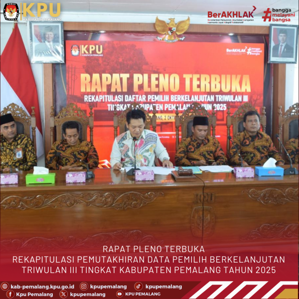 KPU Kabupaten Pemalang melaksanakan Rapat Pleno Terbuka Rekapitulasi Daftar Pemilih Berkelanjutan Triwulan III Tingkat Kabupaten Pemalang Tahun 2025 pada hari Kamis, 2 Oktober 2025 pukul 10.00 WIB bertempat di Kantor KPU Kabupaten Pemalang.
