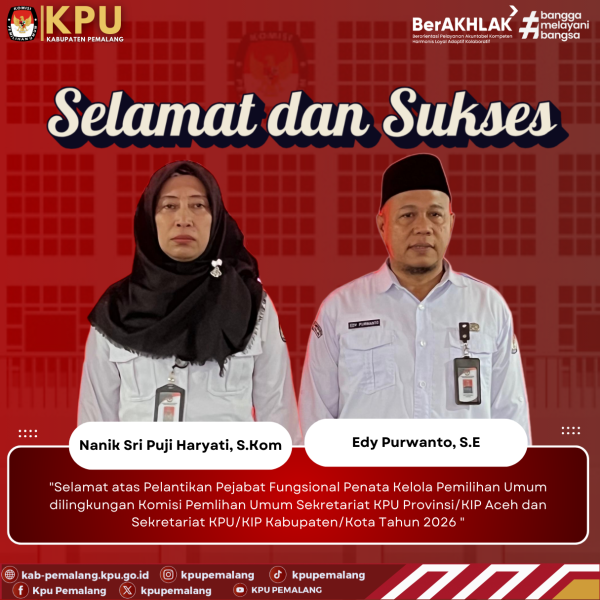Kehadiran Pejabat Fungsional Penata Kelola Pemilu yang baru dilantik di lingkungan KPU Kabupaten Pemalang diharapkan dapat membawa energi baru, khususnya dalam menghadapi tantangan penyelenggaraan pemilu dan pemilihan di masa mendatang.