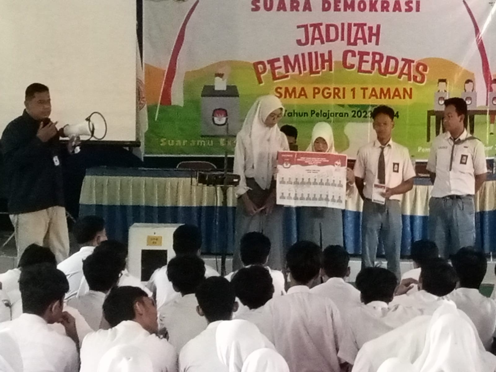 Pemalang, Selasa (26/09/2023) pukul 09.00 WIB Anggota KPU Kabupaten Pemalang Divisi Hukum dan Pengawasan (Wahyono) menghadiri undangan SMA 1 PGRI Taman sebagai narasumber pada kegiatan pendidikan pemilih Projek Penguatan Profil Pelajar Pancasila (P5) dengan tema Suara Demokrasi. Bertempat di aula SMA 1 PGRI Taman dan dihadiri seluruh siswa dan siswi kelas XI beserta para guru pembimbing. Dalam paparannya beliau membahas pemilu yang ada di Indonesia dan penggunaan surat suara yang benar serta pengenalan partai politik sebagai peserta pemilu 2024 dan sejarah Kepemiluan di Indonesia.