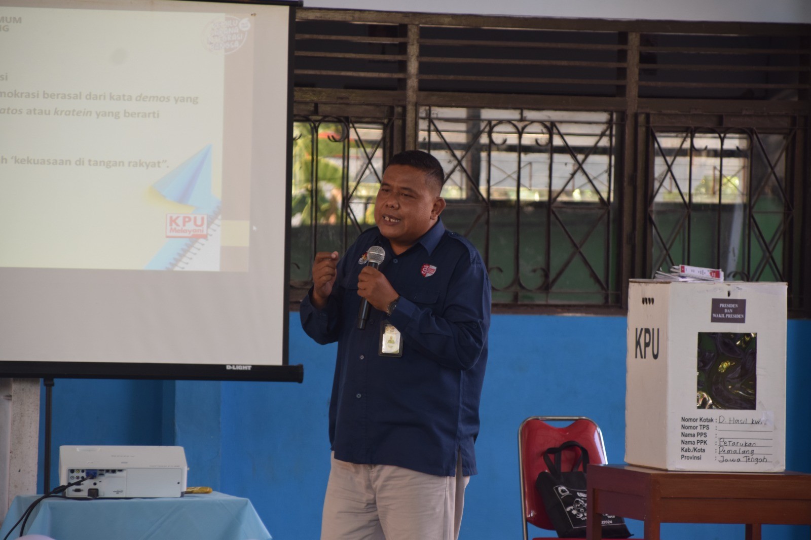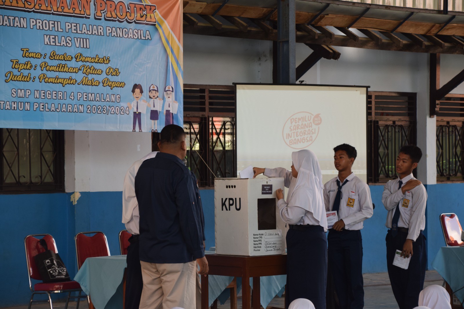 Anggota KPU Kabupaten Pemalang, Wahyono menjadi narasumber pada kegiatan Proyek Penguatan Profil Pelajar Pancasila (P5) di SMP Negeri 4 Pemalang, Selasa (12/09/2023) pukul 09.00 WIB. Kegiatan P5 tersebut bertemakan “Suara Demokrasi” dengan peserta seluruh siswa kelas VIII. Materi yang disampaikan yakni terkait dengan demokrasi dan bagaimana pemilu di Indonesia berlangsung dari tahun ke tahun. Kegiatan tersebut diharapkan mampu memberikan pengetahuan tentang pentingnya pemilu dilaksanakan.