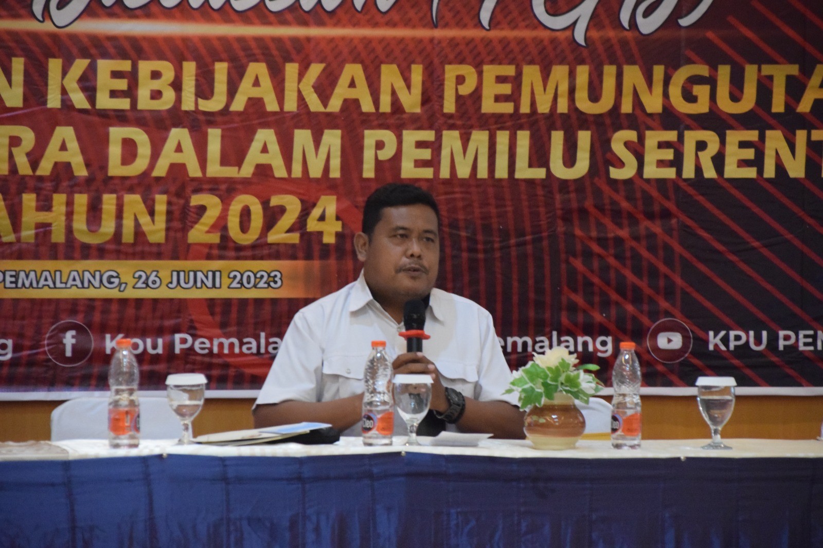 KPU Kabupaten Pemalang melaksanakan Focus Group Discussion (FGD) Penyampaian Rumusan Kebijakan Pemungutan dan Penghitungan Suara dalam Pemilu Tahun 2024 di Hotel Regina Pemalang, Senin (26/06/2023). Hadir pada kegiatan tersebut Forkopimda, Dinas/Instansi, Bawaslu, Organisasi Masyarakat, serta Partai Politik se-Kabupaten Pemalang.