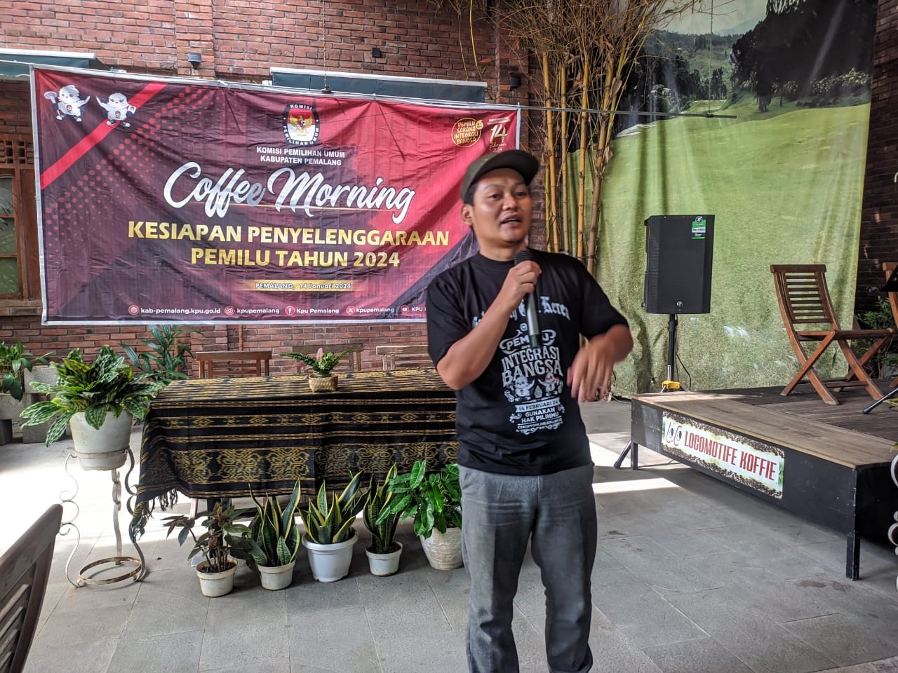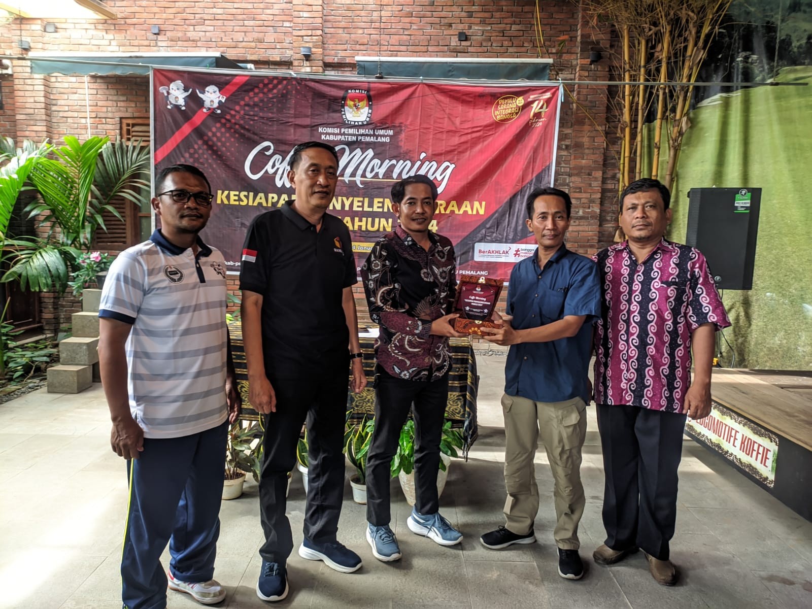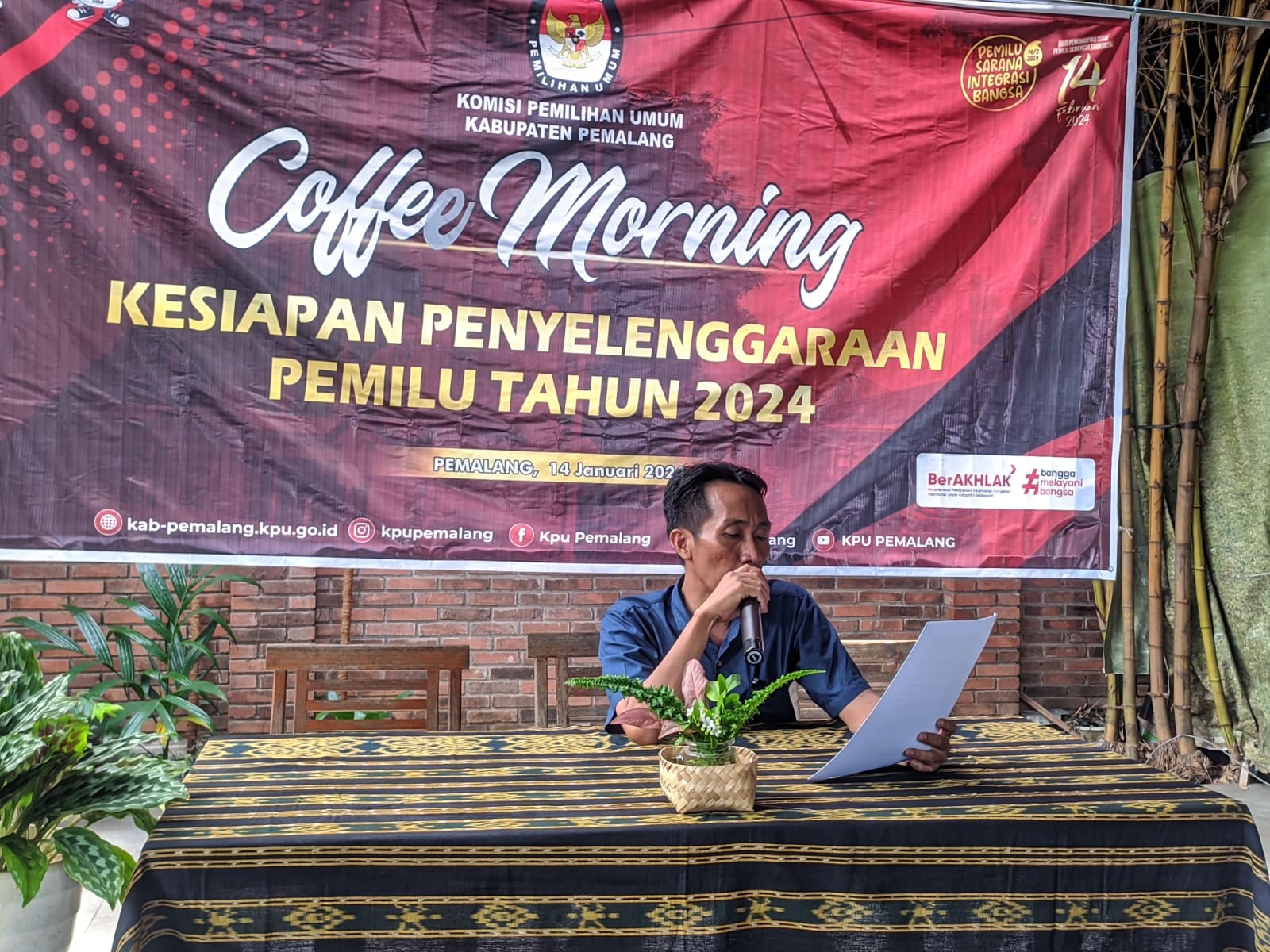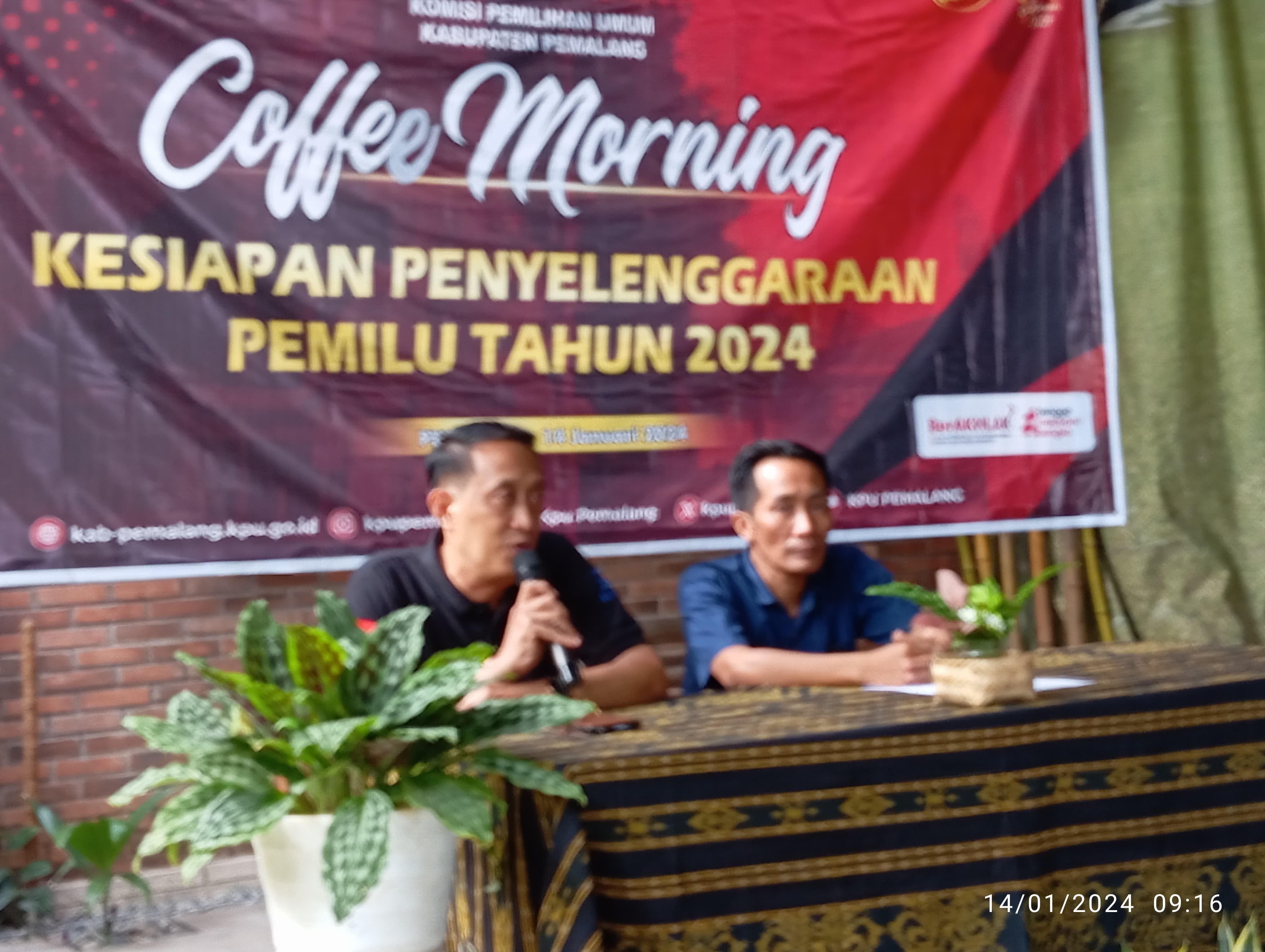 KPU Kabupaten Pemalang menyelenggarakan Coffe Morning dengan tema "Kesiapan Penyelenggaraan Pemilu Tahun 2024" di Cafe Lokomotif Pemalang, Minggu (14/01/2024) pukul 07.00 WIB. Hadir pada kegiatan tersebut Bawaslu Kabupaten Pemalang, Ketua PPK se-Kabupaten Pemalang dan Ketua Panwascam se-Kabupaten Pemalang. Rapat dibuka oleh Anggota KPU Supriyanto dilanjutkan pembahasan Daftar Inventaris Masalah Terkait Persiapan Pemilu Tahun 2024.