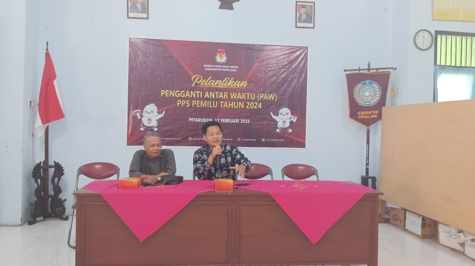 KPU Kabupaten Pemalang melantik Pengganti Antar Waktu (PAW) Panitia Pemungutan Suara (PPS) desa Pesucen Kecamatan Petarukan, Jum’at (17/02/2023). Pengambilan sumpah dilakukan oleh Anggota KPU Agus Setiyanto kepada PAW PPS desa Pesucen di Kantor Kecamatan Petarukan. Turut hadir pada kegiatan tersebut Ketua Bawaslu Kabupaten Pemalang.