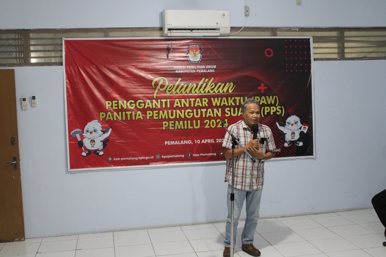 PEMALANG - KPU Kabupaten Pemalang secara resmi melantik Pengganti Antar Waktu (PAW) Panitia Pemungutan Suara (PPS) Kelurahan Kebondalem Kecamatan Pemalang, Senin (10/04/2023). Pengambilan sumpah dilakukan oleh Anggota KPU Agus Setiyanto kepada PAW PPS Kelurahan Kebondalem di Kantor KPU Kabupaten Pemalang.
