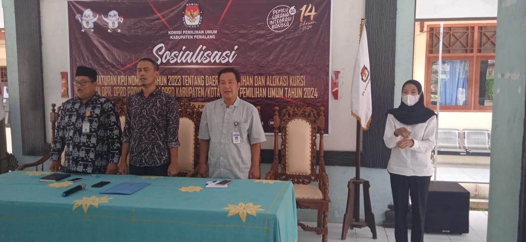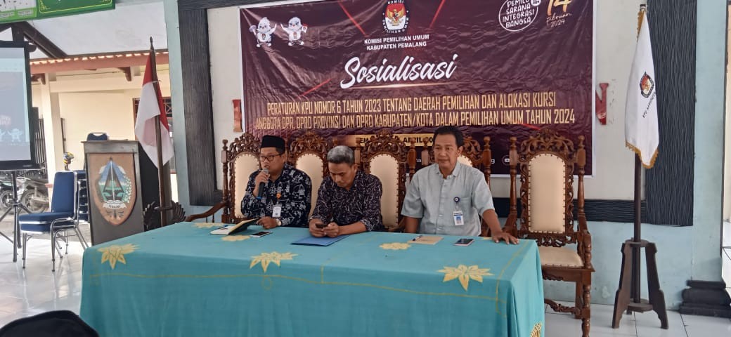 Pemalang, Kamis (6/4/2023) KPU Kabupaten Pemalang mensosialisasikan PKPU No. 6 Tahun 2023 Tentang Daerah Pemilihan dan Alokasi Kursi Anggota DPR, DPRD Provinsi, DPRD kabupaten/kota Dalam Pemilihan Umum Tahun 2024, di Pendopo Kecamatan Petarukan.