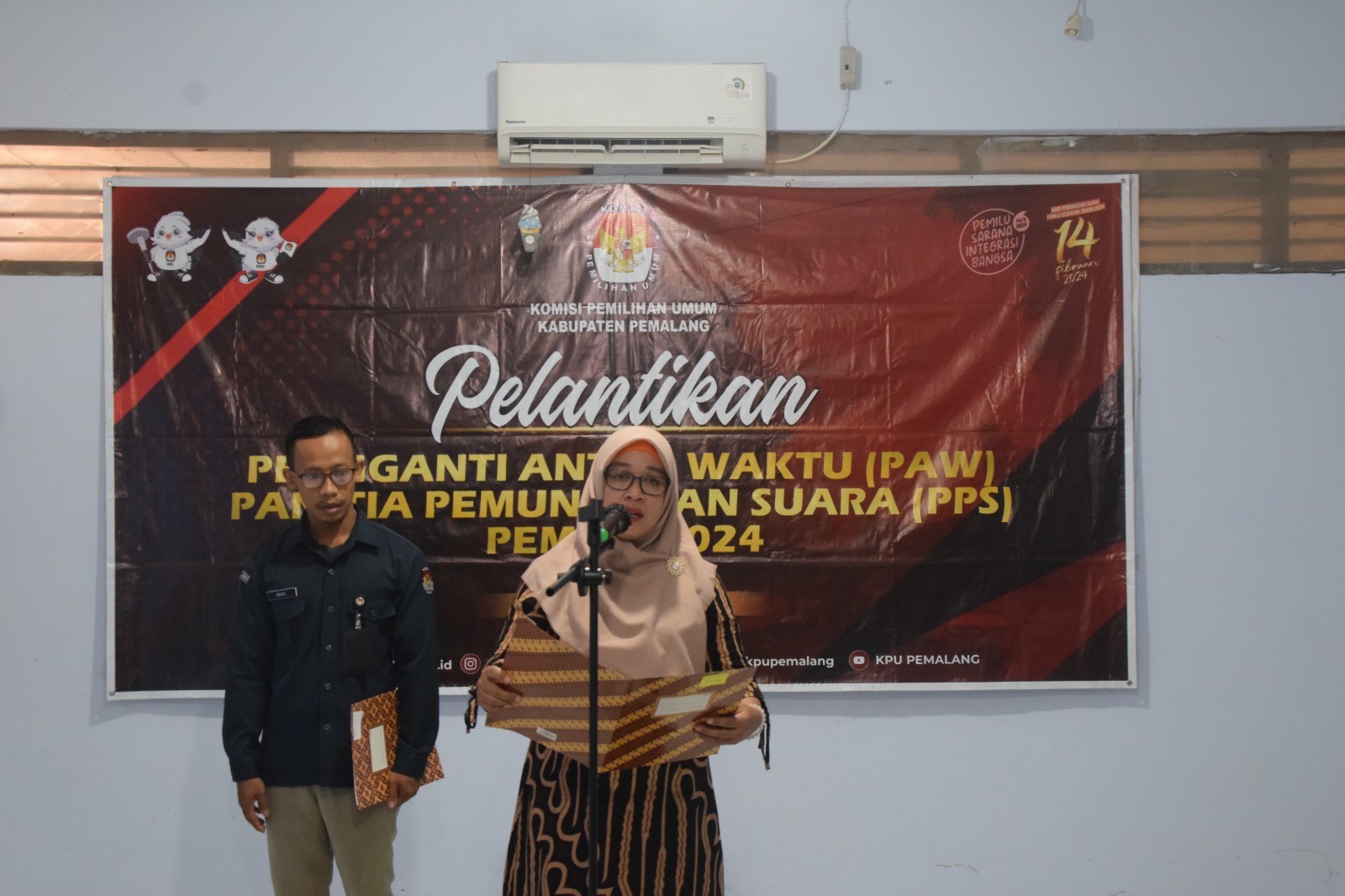 KPU Kabupaten Pemalang melantik pengganti antar waktu (PAW) Panitia Pemungutan Suara (PPS) Desa Mandiraja dan Panitia Pemungutan Suara(PPS) Desa Walangsanga Kecamatan Moga bertempat di Ruang Rapat KPU Kabupaten Pemalang, Sabtu (14 /10/2023) pukul 09.00 WIB. Hadir pada kegiatan tersebut Bawaslu Kabupaten Pemalang, PPK Kecamatan Moga, PPS Desa Madiraja, dan PPS Desa Walangsanga. Pengambilan sumpah dilakukan oleh Plt. Ketua KPU Kabupaten Pemalang Aida Yunirahmawati.