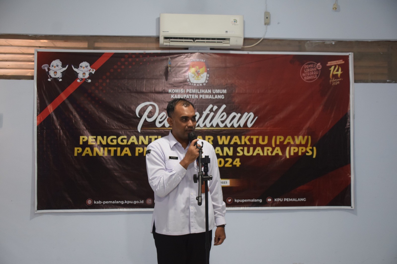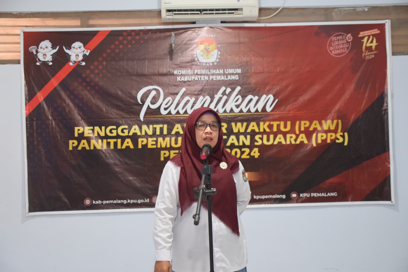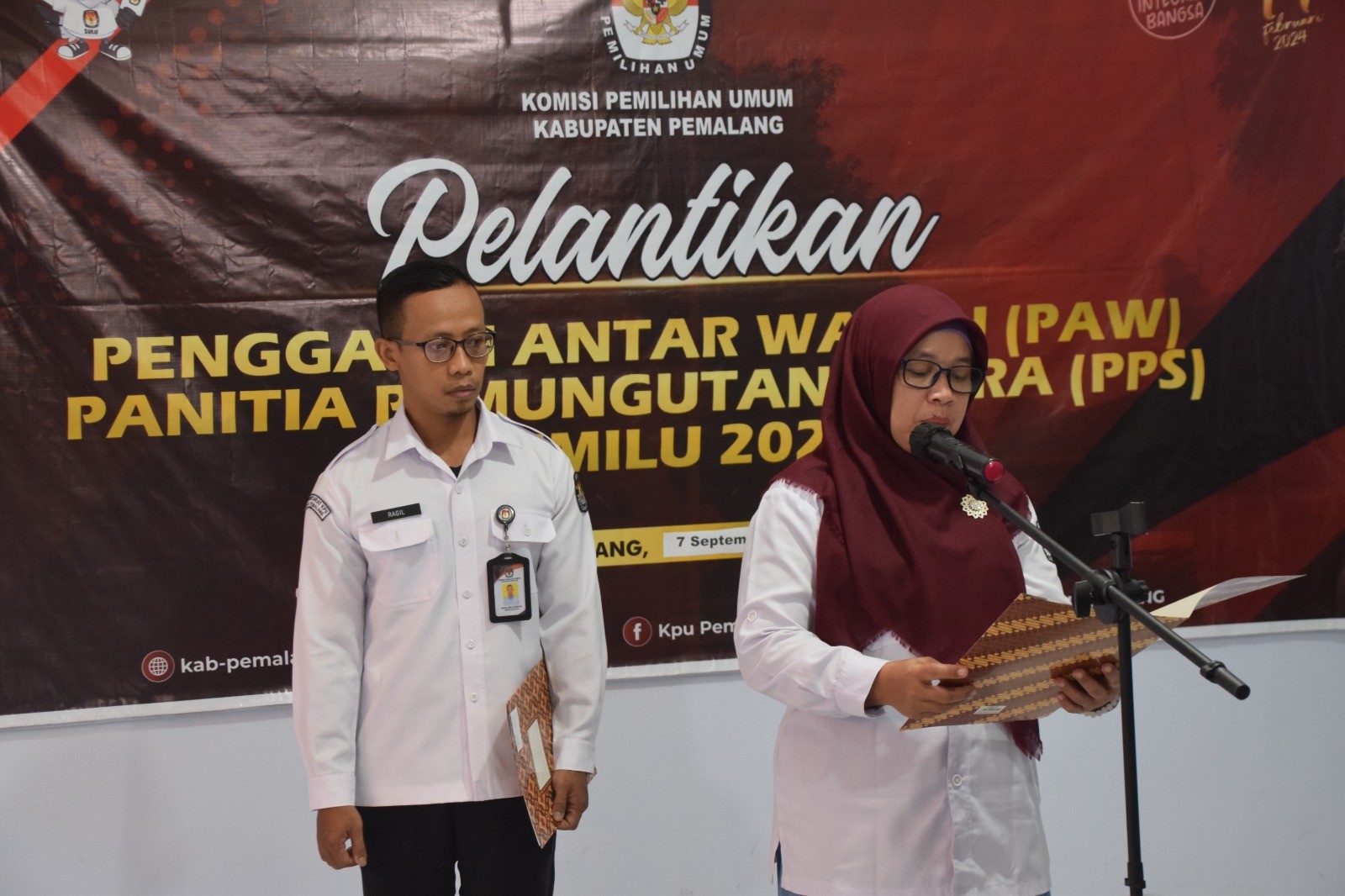 KPU Kabupaten Pemalang melantik pengganti antar waktu (PAW) Panitia Pemungutan Suara (PPS) Desa Jebed Selatan Kecamatan Taman dan Panitia Pemungutan Suara (PPS) Desa Kalirandu Kecamatan Petarukan bertempat di ruang rapat KPU Kabupaten Pemalang, Kamis (7 /9/2023) pukul 13.00 WIB. Hadir pada kegiatan tersebut Bawaslu Kabupaten Pemalang, PPK Kecamatan Taman, PPS Desa Jebed Selatan, PPK Kecamatan Petarukan dan PPS Desa Kalirandu. Pengambilan sumpah dilakukan oleh Plt. Ketua KPU Kabupaten Pemalang Aida Yunirahmawati.