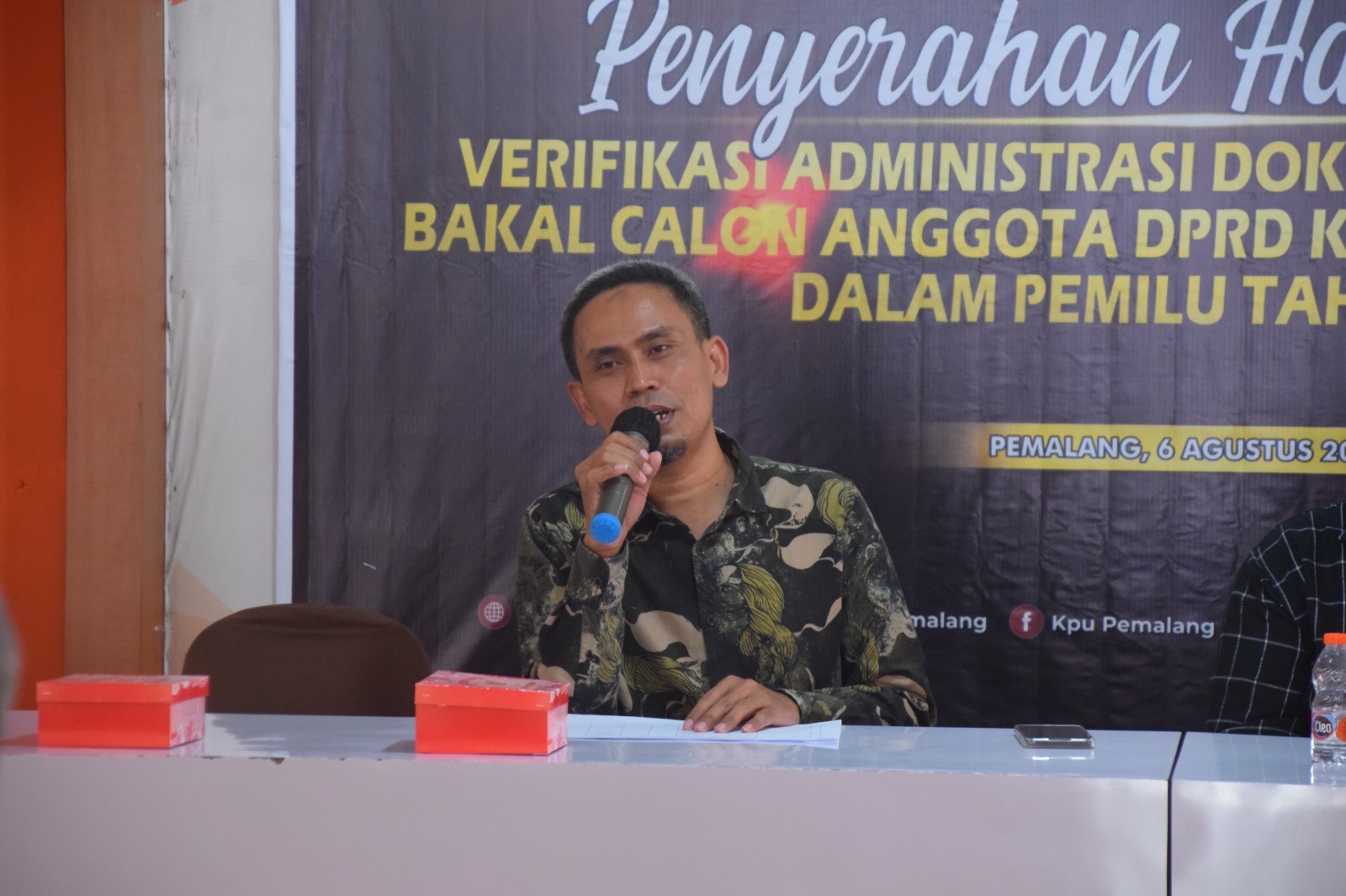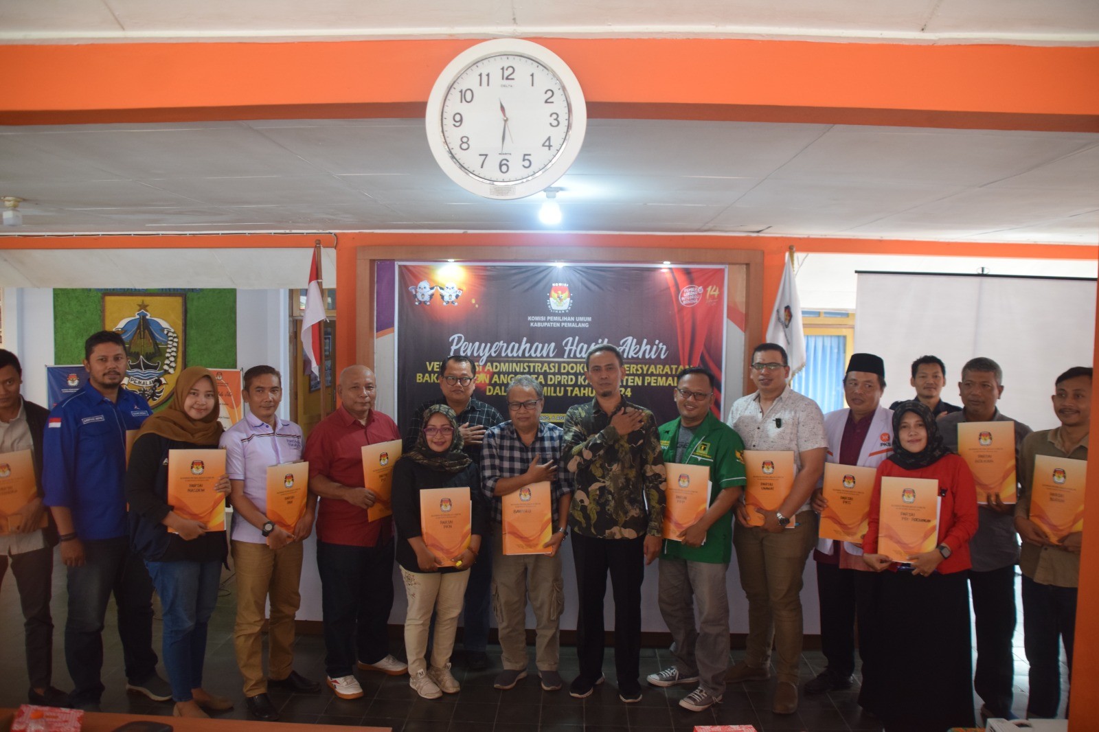 KPU Kabupaten Pemalang menyerahkan hasil akhir verifikasi administari dokumen persyaratan bakal calon Anggota DPRD Kabupaten Pemalang dalam Pemilu Tahun 2024 di Pendopo KPU Kabupaten Pemalang, Minggu (06/08/2023) pukul 10.00 WIB. Acara dibuka oleh Ketua KPU Mustaghfirin, dilanjutkan penyampaian materi oleh Anggota KPU Harun Gunawan, dan diakhiri dengan penyerahan hasil akhir verifikasi administrasi dokumen persyaratan bakal calon Anggota DPRD Kabupaten Pemalang. Hadir dalam acara tersebut Bawalu Kabupaten Pemalang serta Partai Politik se-Kabupaten Pemalang.