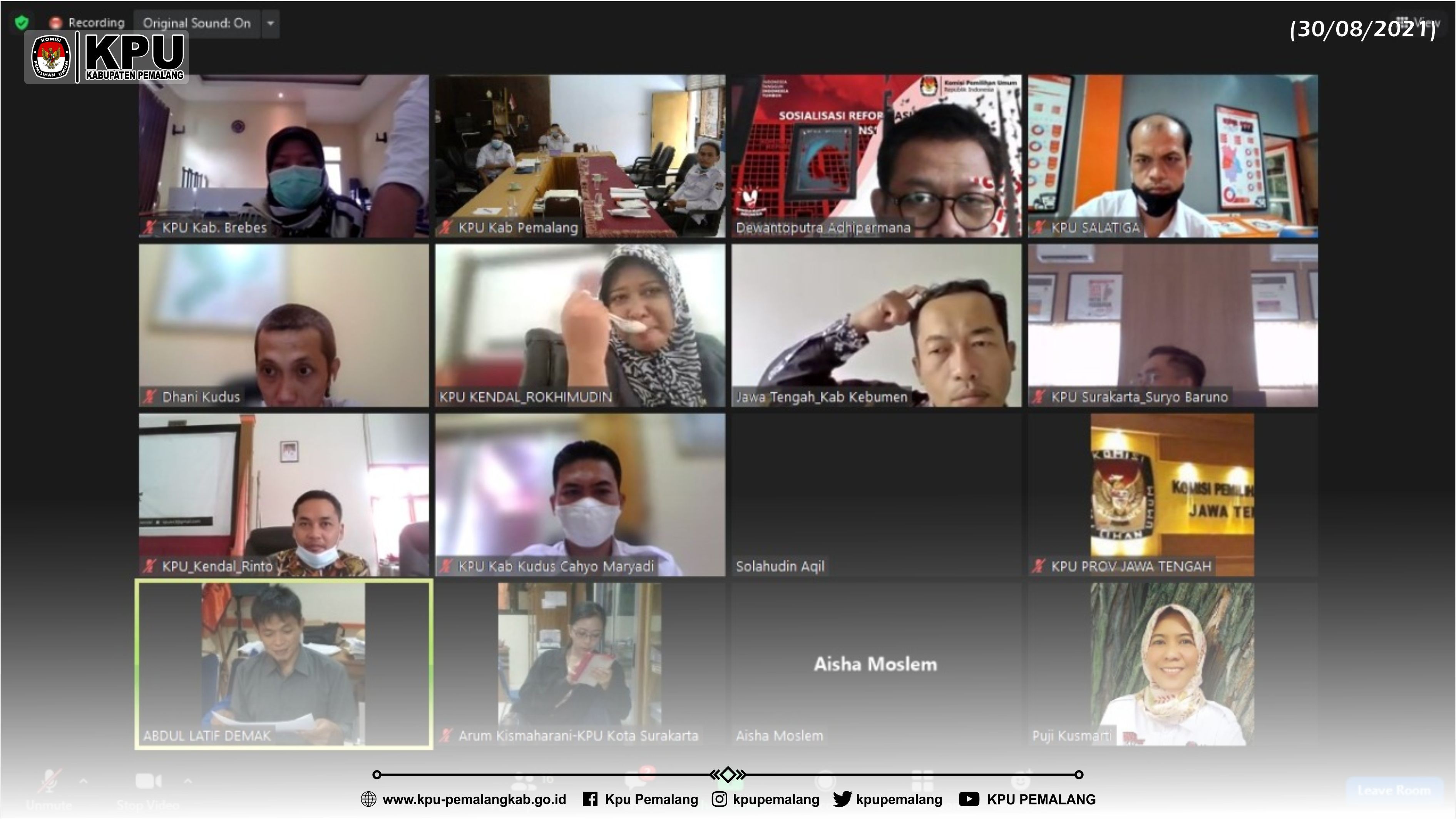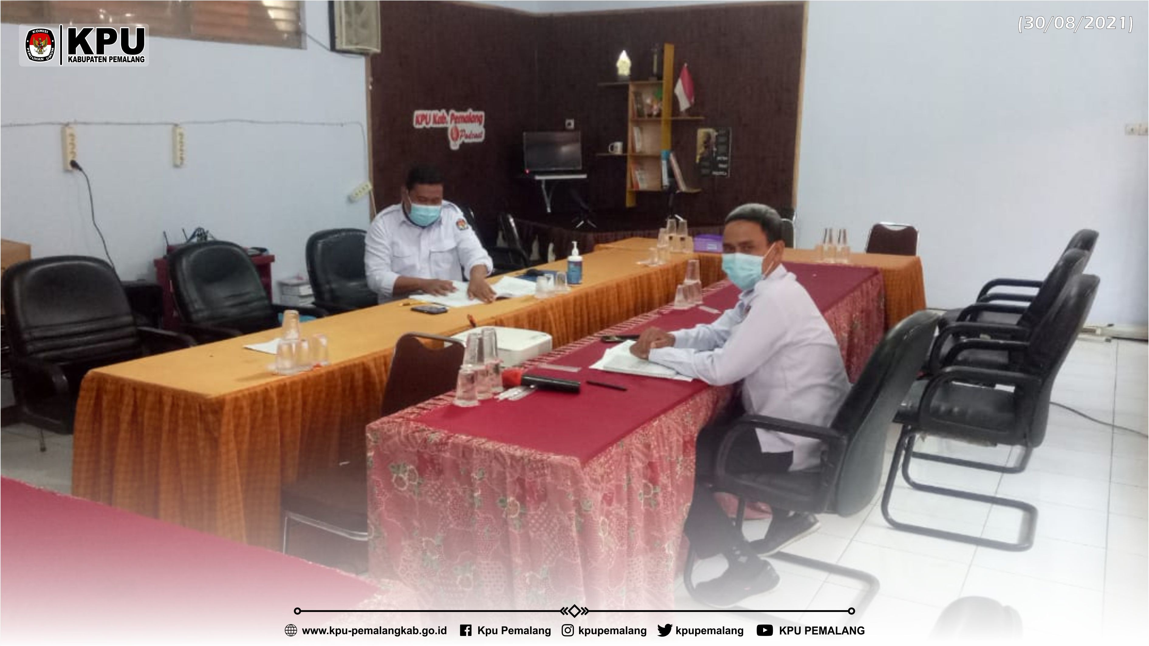 Senin 30 Agustus 2021 Komisi Pemilihan Umum Kabupaten Pemalang mengikuti kegiatan zoom meeting dengan tema Pencermatan Hasil Kajian Internal Rancangan PKPU Pendaftaran, Verifikasi dan Penetapan Partai Politik Peserta Pemilu Tahun 2024 yang bertempat di ruang rapat turut hadir Bpk. Harun Gunawan dan Bpk. Wahyono anggota KPU Kabupaten Pemalang divisi Teknis Penyelenggara dan divisi. Hukum dan Pengawasan, kegiatan tersebut juga di ikuti oleh Kasubag Teknis Hupmas. Kegiatan tersebut di selenggarakan oleh KPU Provinsi Jawa Tengah dengan narasumber Bpk Bpk. Muslim Aisha nggota KPU Provinsi Jawa Tengah.