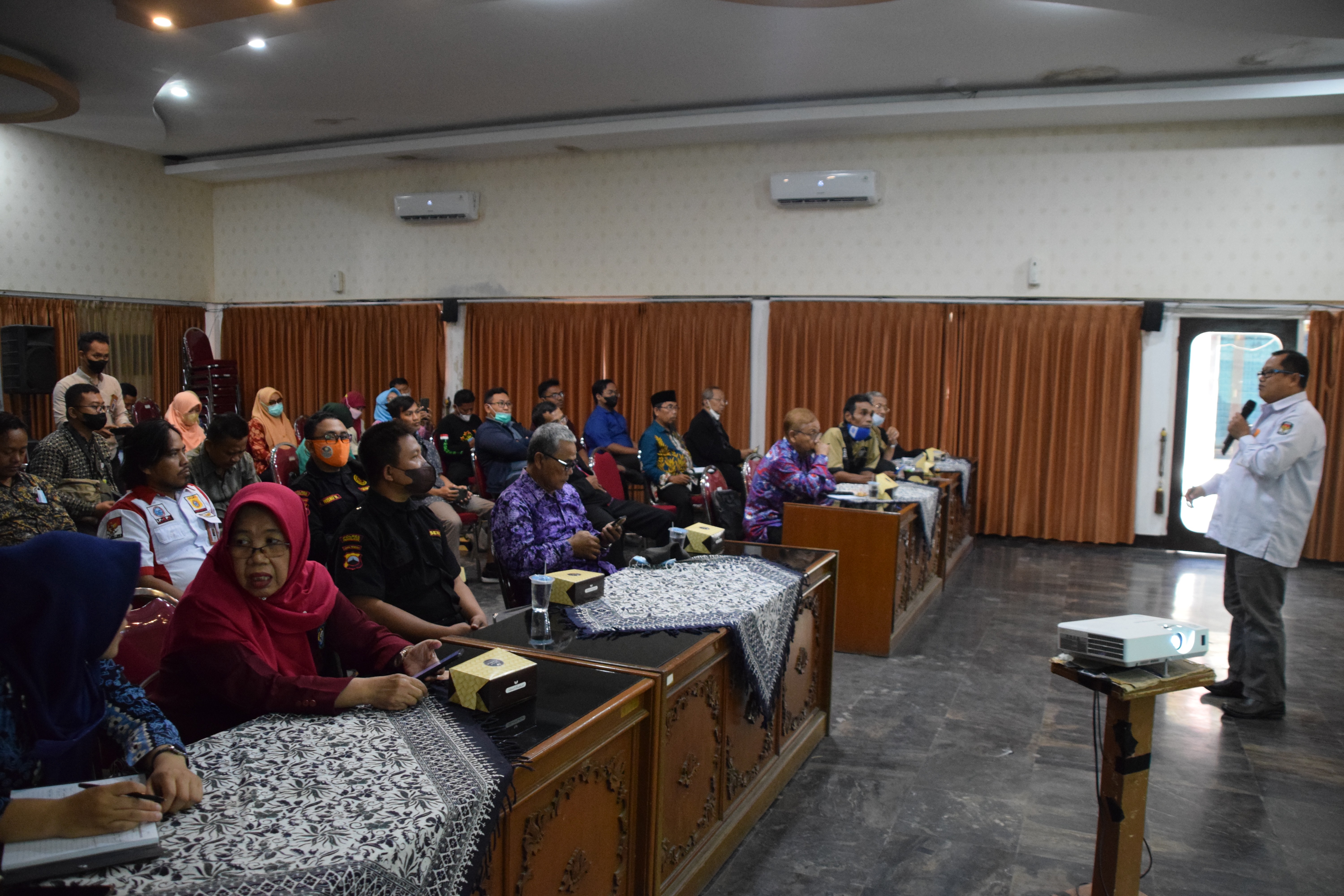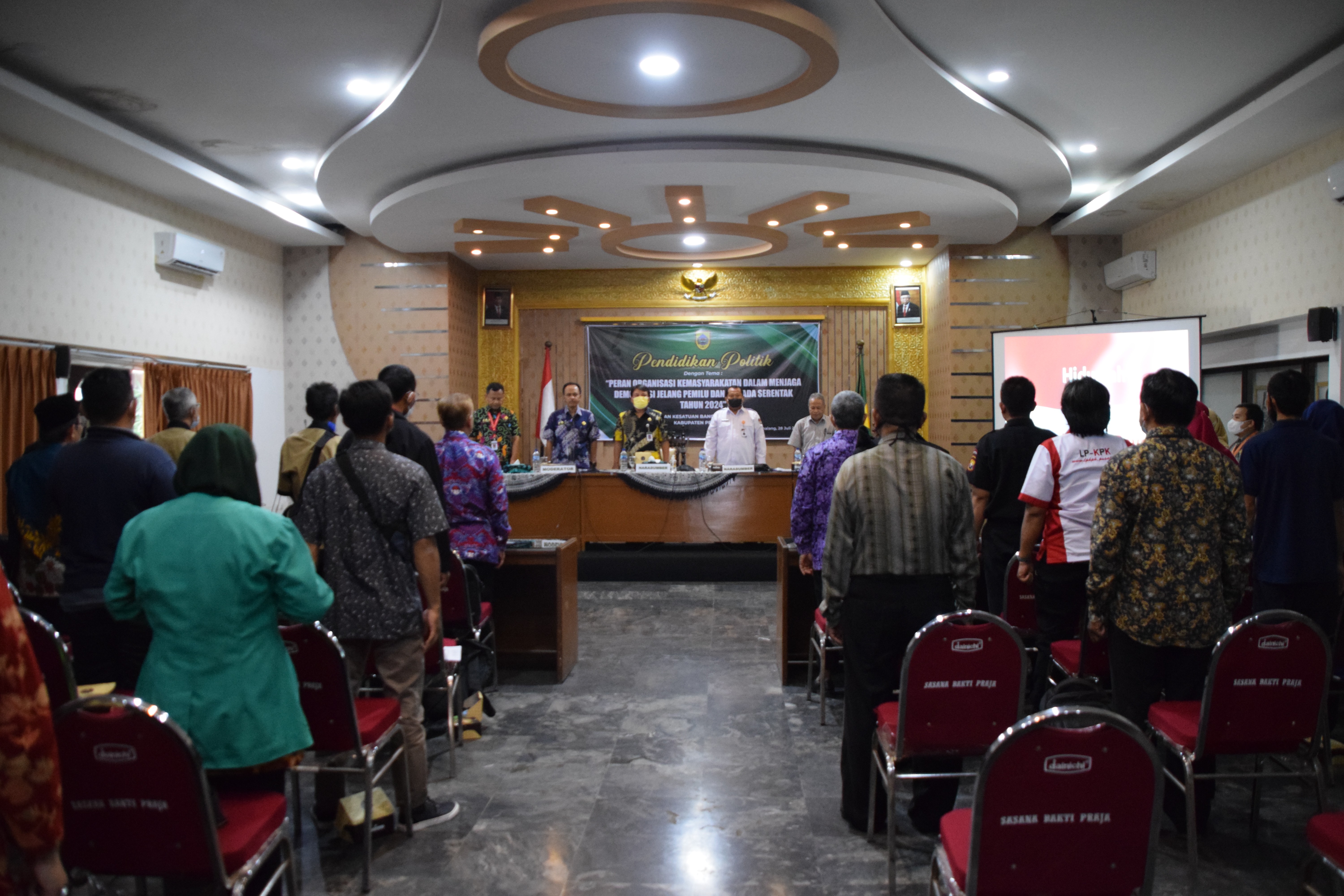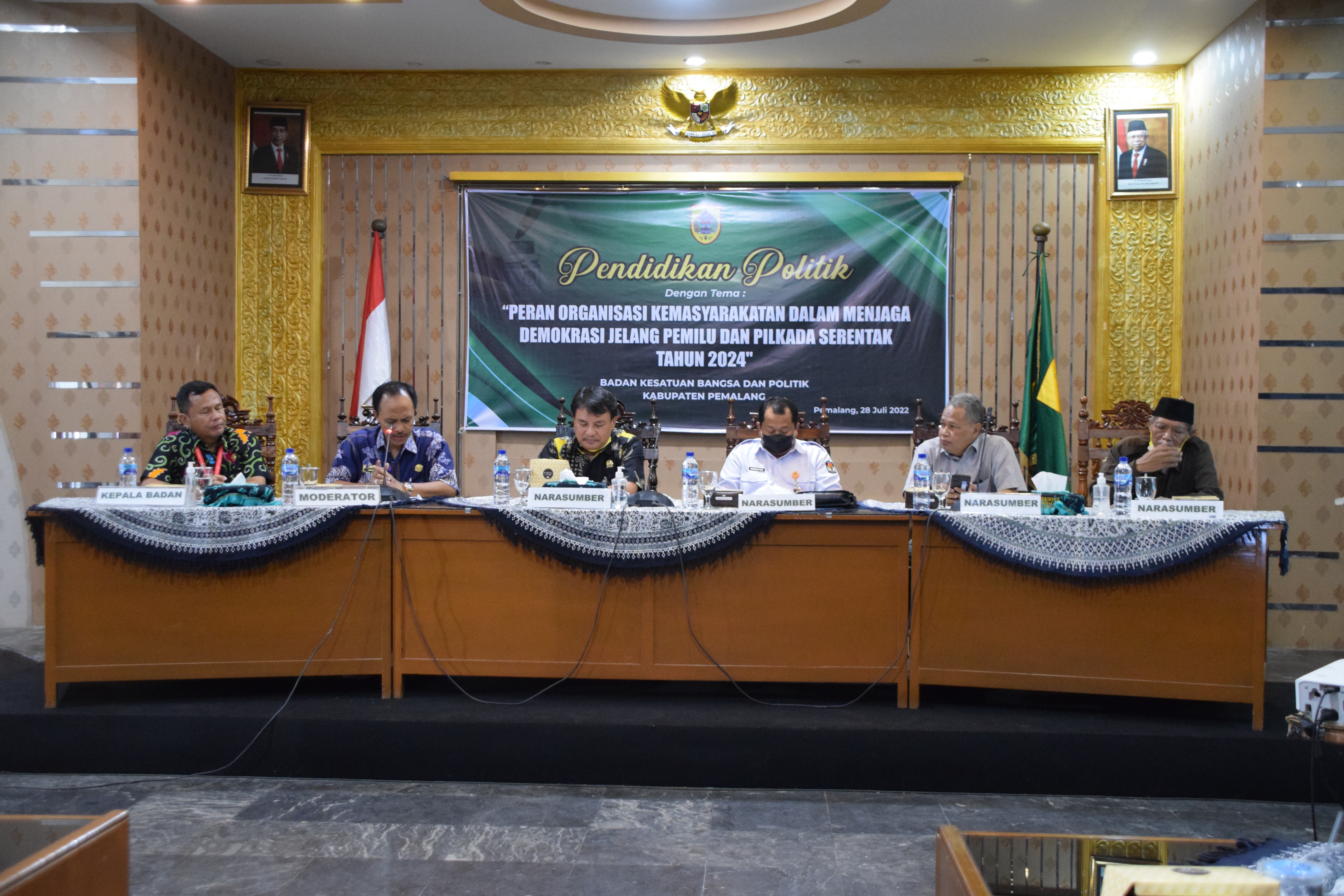 Kamis, 28 Juli 2022 pukul 09.00 WIB Ketua KPU Kabupaten Pemalang Mustaghfirin menghadiri undangan sebagai Narasumber pada kegiatan Pendidikan Politik yang diselenggarakan oleh Bakesbangpol Kabupatèn Pemalang dengan tema "Peran organisasi kemasyarakatan dalam menjaga demokrasi jelang pemilu dan pilkada serentak tahun 2024”. Bertempat di Sasana Bhakti Praja Kabupaten Pemalang dengan peserta Organisasi Masyarakat di Kabupaten Pemalang.