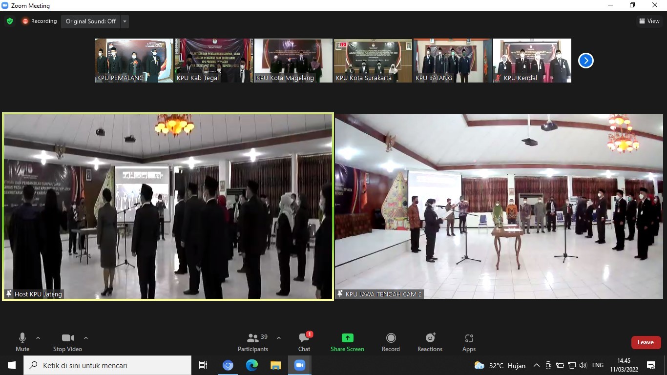 Jumat, 11 Maret 2022 pukul 14.00 WIB, KPU Kabupaten Pemalang mengikuti kegiatan Pengambilan Sumpah Jabatan Pengawas pada Sekretariat KPU Provinsi Jawa Tengah dan KPU Kabupaten/Kota Se-Jawa Tengah via daring. Bertempat di Ruang Rapat KPU Kabupaten Pemalang, dihadiri oleh Ketua beserta Anggota KPU Kabupaten Pemalang, juga Sekretaris KPU Kabupaten Pemalang turut mendampingi empat kasubag KPU Kabupaten Pemalang untuk mengikuti sumpah janji yang dimpimpin oleh Sri Lestariningsih (Sekretaris KPU Provinsi Jawa Tengah). Pada sambutannya, Sri Lestariningsih membacakan sambutan dari Sekretaris Jenderal KPU RI, Bernard Dermawan Sutrisno. Acara Pelantikan dan pengambilan sumpah janji sebagai bagian dari pelaksanaan PKPU nomor 14 tahun 2020 secara tuntas.