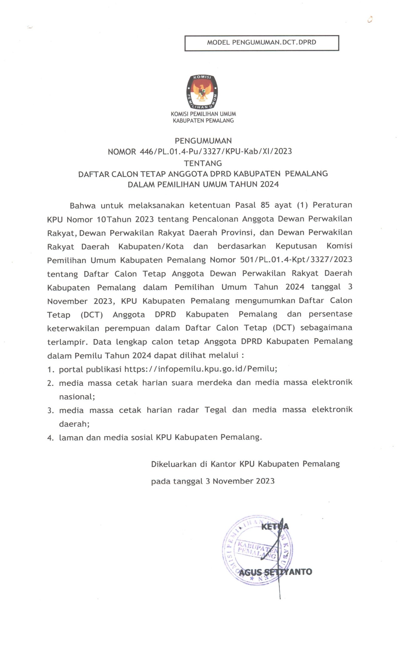 Pengumuman Daftar Calon Tetap Anggota DPRD Kabupaten Pemalang Pemilu Tahun 2024