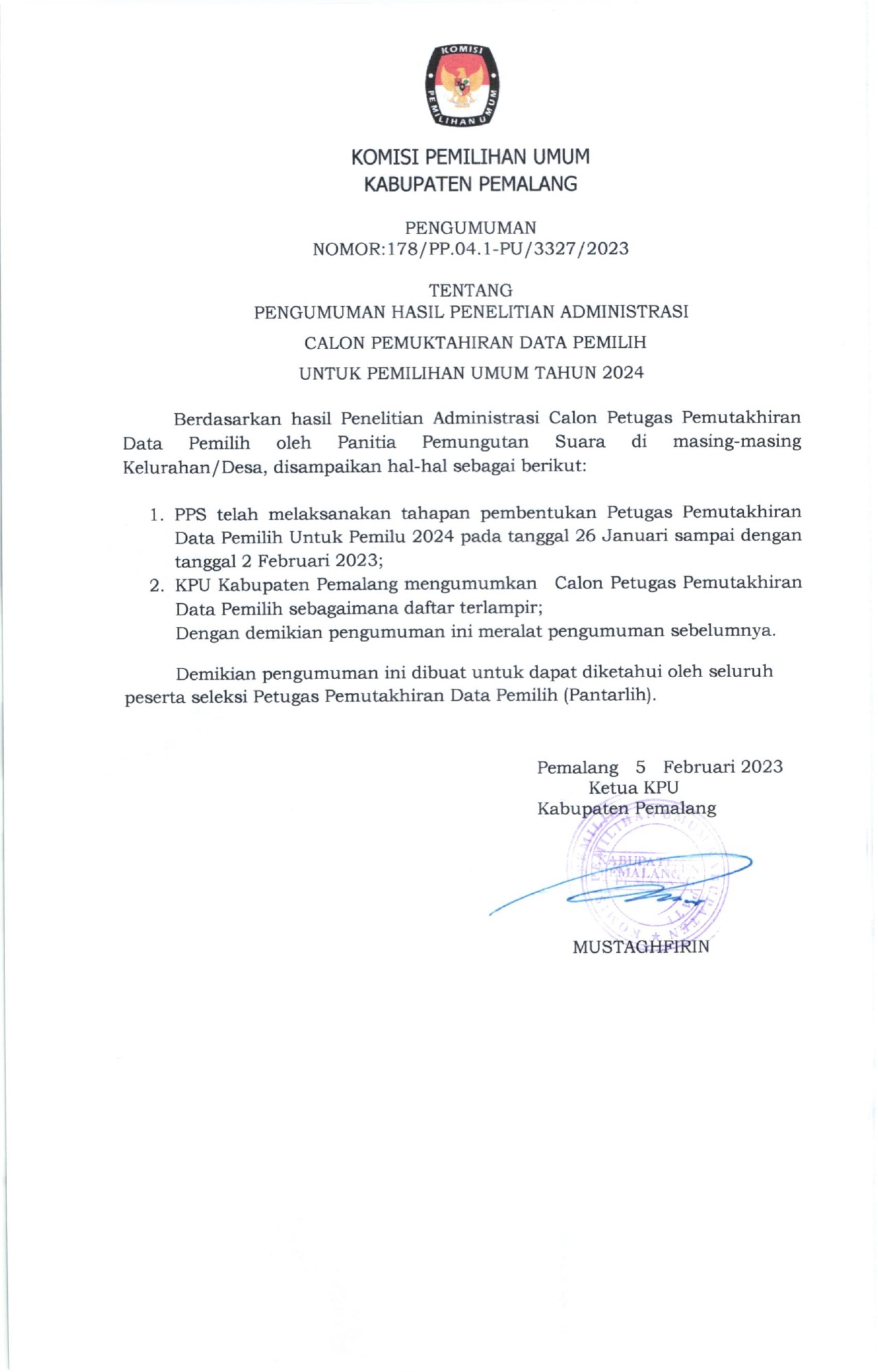 Pengumuman Hasil Penelitian Administrasi Calon Pemutakhiran Data Pemilih untuk Pemilihan Umum Tahun 2024 Selasa, 07 Februari 2023 07:00 405 Untuk pengumuman lengkap Klik disini Bagikan: Telah dilihat 405 kali