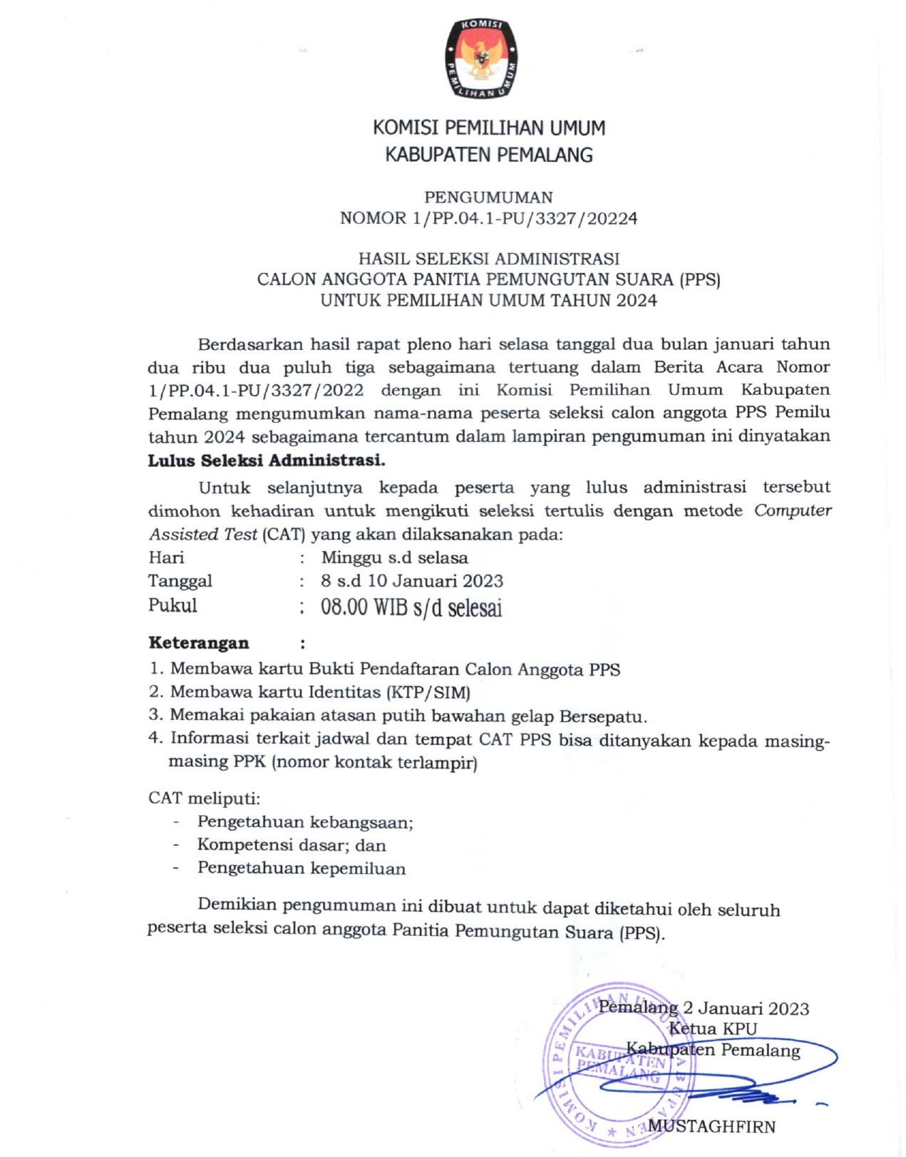 Pengumuman Hasil Seleksi Administrasi Panitia Pemungutan Suara untuk Pemilihan Umum Tahun 2024 Selasa, 03 Januari 2023 00:00 1628 Untuk pengumuman lengkap Klik disini Bagikan: Telah dilihat 1,628 kali