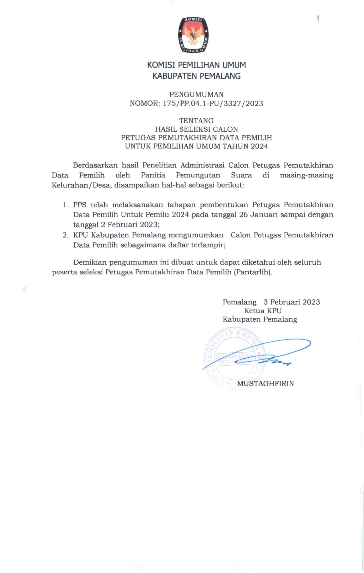 Pengumuman Hasil Seleksi Calon Petugas Pemutakhiran Data Pemilih Untuk Pemilihan Umum Tahun 2024 Jumat, 03 Februari 2023 19:00 627 Untuk pengumuman lengkap Klik disini Bagikan: Telah dilihat 627 kali