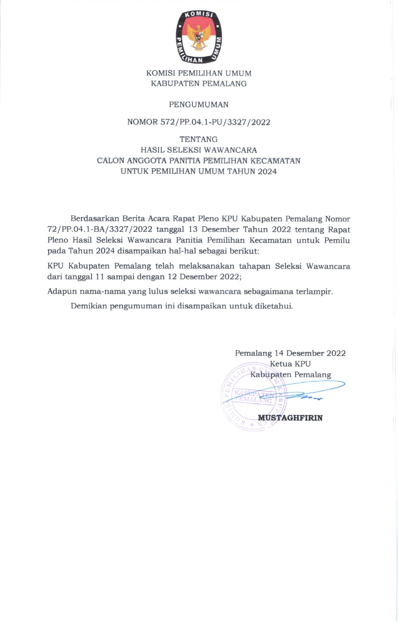 Pengumuman Hasil Seleksi Wawancara Panitia Pemilihan Kecamatan untuk Pemilihan Umum Tahun 2024 Rabu, 14 Desember 2022 03:43 809 Untuk pengumuman lengkap Bagikan: Telah dilihat 809 kali