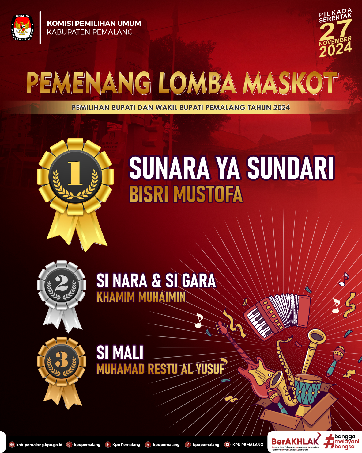 Pengumuman Nomor 317/PP.06.2-PU/3327/2024 Tentang Penetapan Pemenang Lomba Cipta Jingel dan Maskot Pemilihan Bupati dan Wakil Bupati Pemalang Tahun 2024 dapat diunduh disini