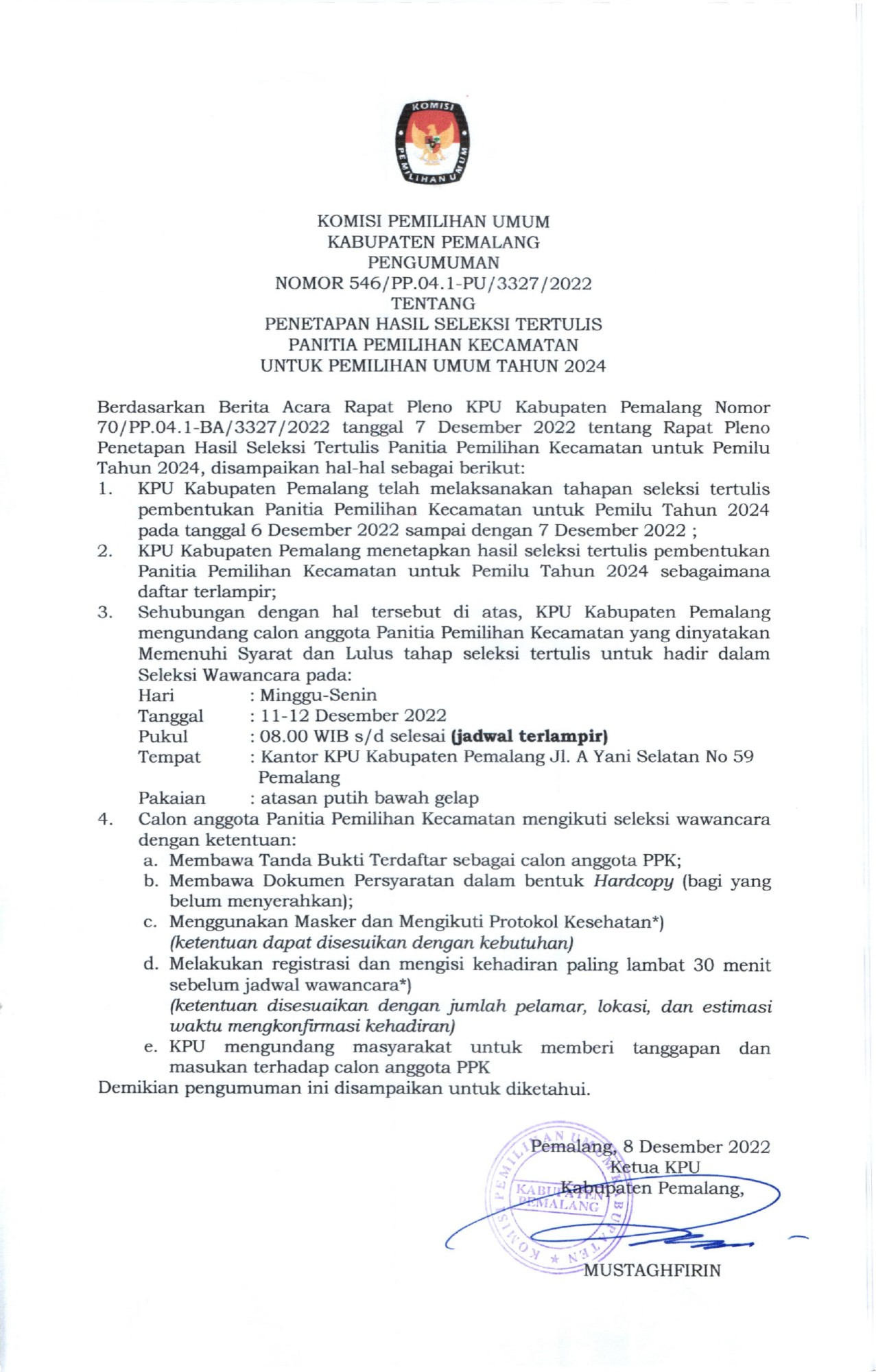Pengumuman Penetapan Hasil Seleksi Tertulis Panitia Pemilihan Kecamatan untuk Pemilihan Umum Tahun 2024 Rabu, 07 Desember 2022 23:12 585 Untuk pengumuman lengkap Bagikan: Telah dilihat 585 kali