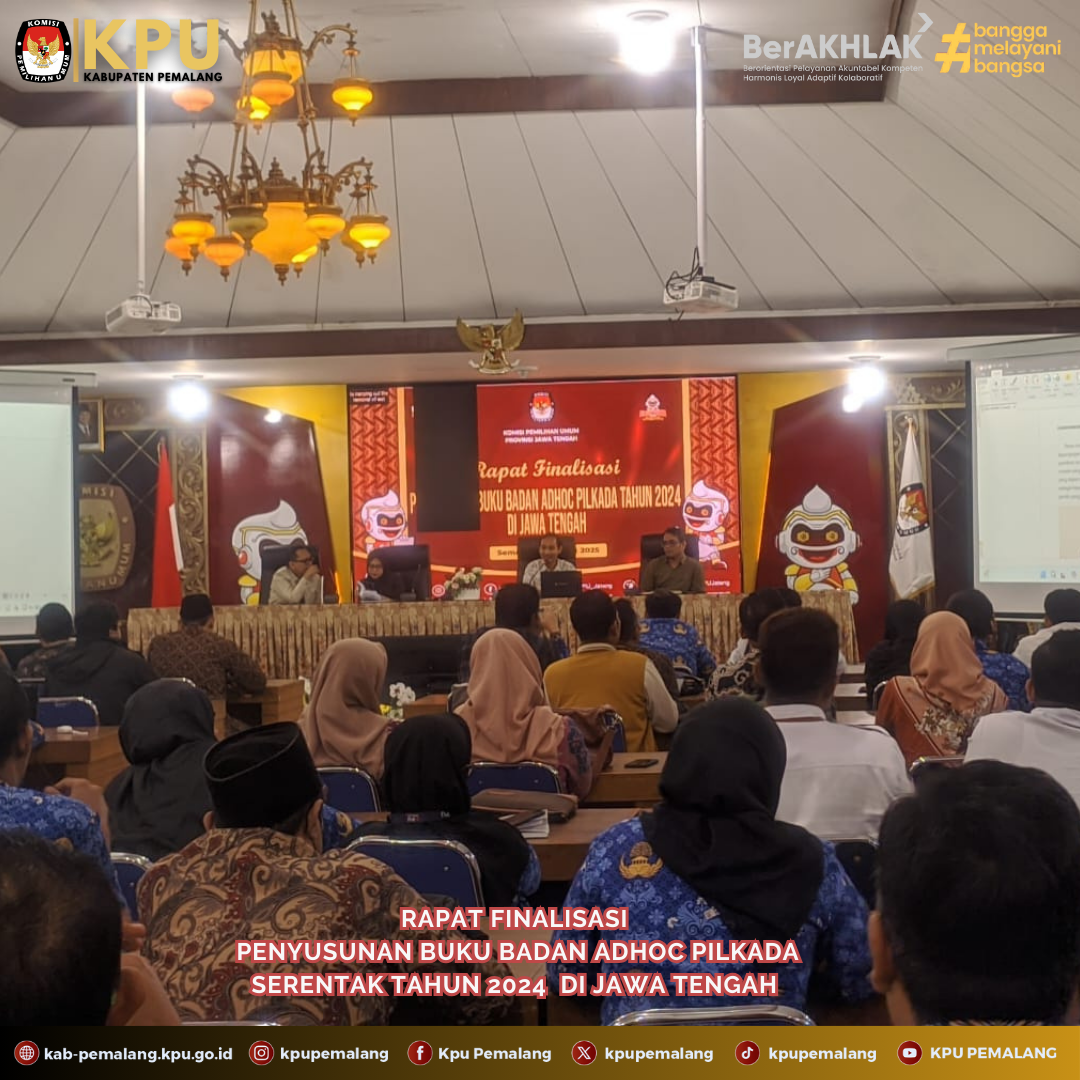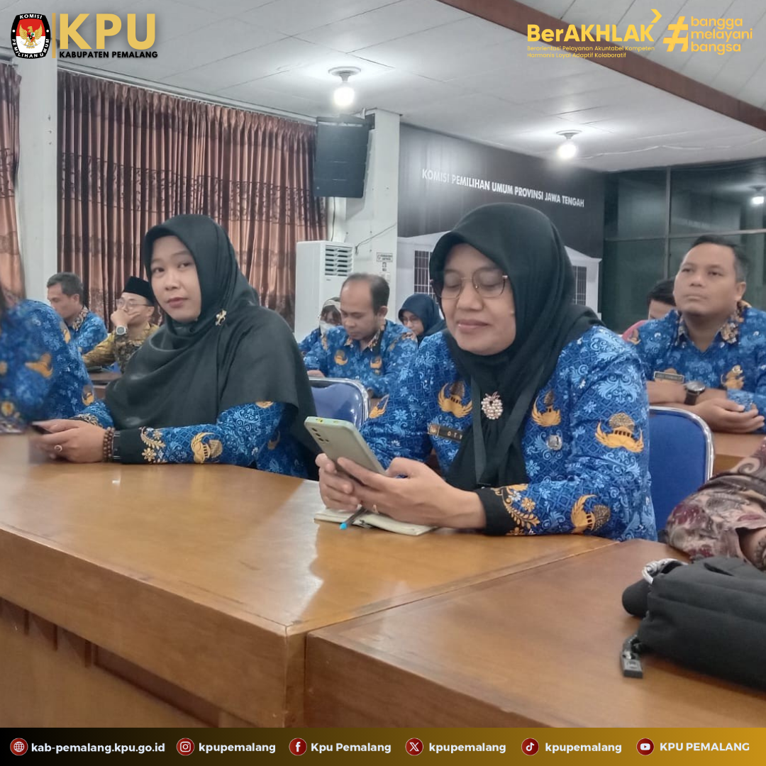 #TemanPemilih, KPU Kabuppaten Pemalang Menghadiri Rapat Finalisasi Penyusunan Buku Badan Adhoc Pilkada Tahun 2024 di Jawa Tengah pada Senin, 17/4/2025 bertempat di kantor KPU Provinsi Jawa Tengah. Acara dibuka oleh Kadiv SDM Mey Nurlela, dilanjutkan sambutan oleh Kadiv Hukum dan Pengawasan Muslim Aisyah, beliau menyampaikan perlunya dokumentasi dan di diharapkan KPU Kab/Kota se Jawa Tengah membuat buku Pilkada Tahun 2024 bertujuan untuk memberikan pendidikan pemilih bagi masyarakat, buku yang ditulis dalam jangka pangjang mampu memberikan kesan yang luas tentang penyelenggaraan Pilkada Tahun 2024.