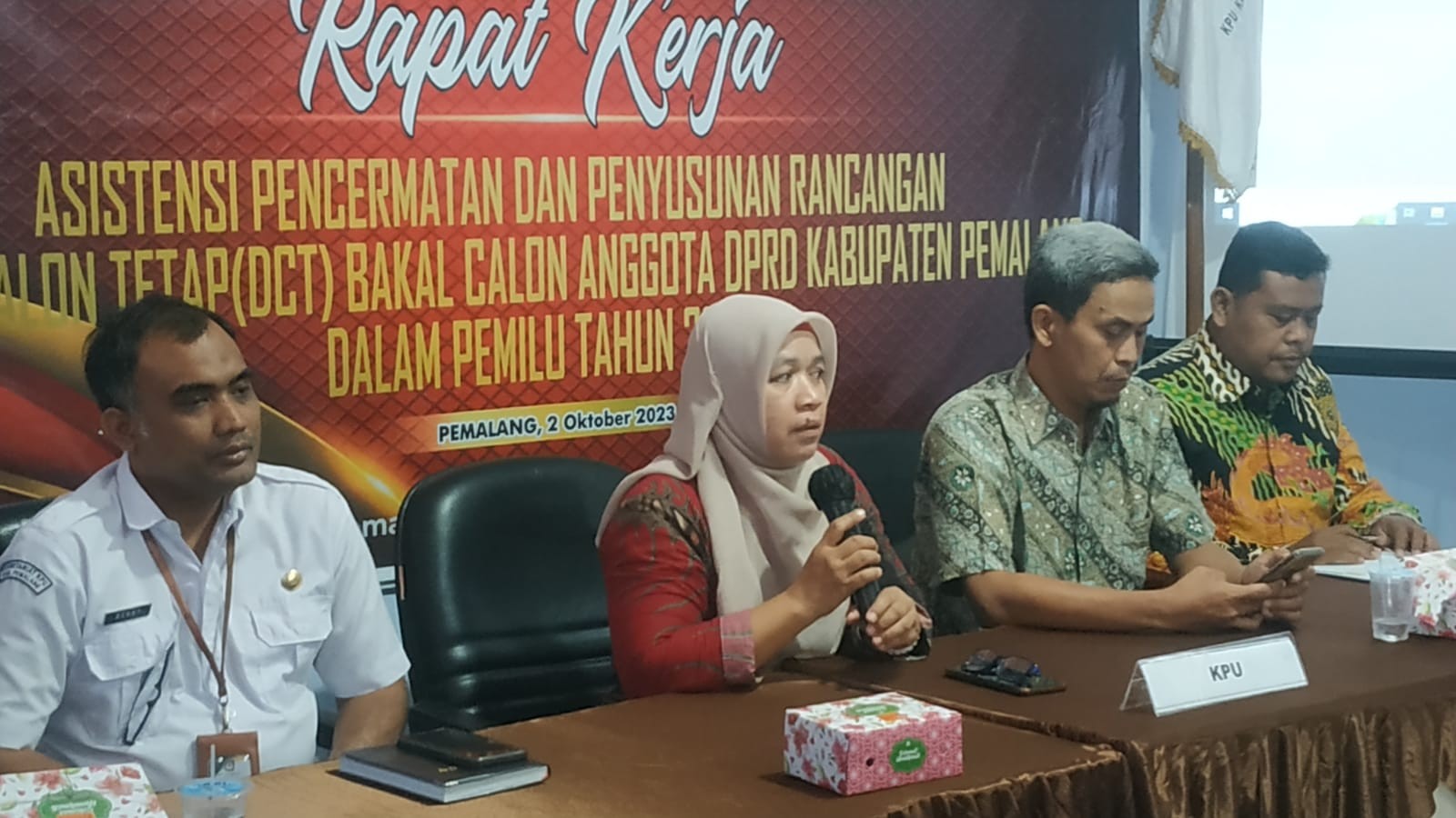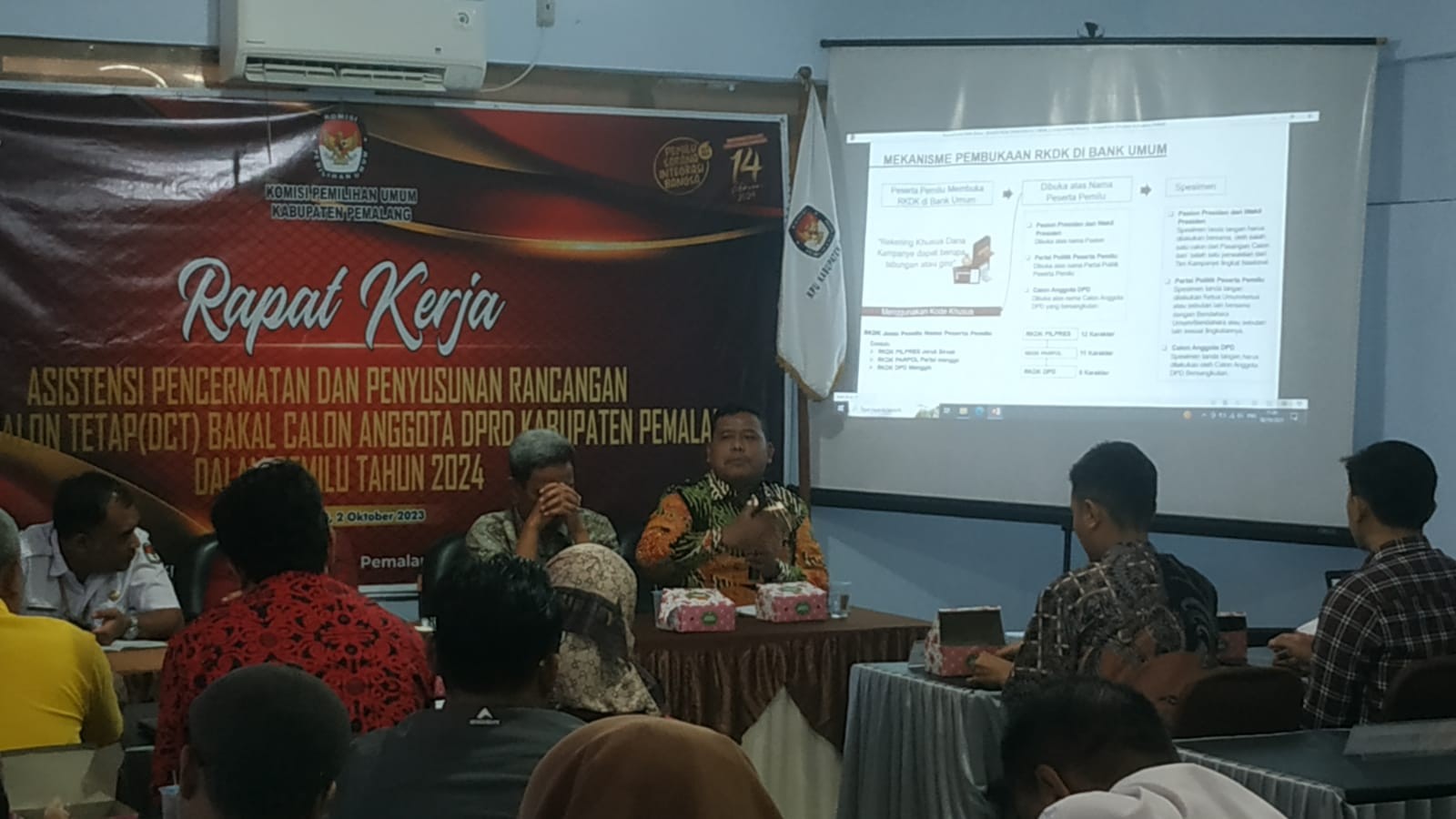 KPU Kabupaten Pemalang menyelenggarakan Rapat Kerja Asistensi Pencermatan dan Penyusunan Rancangan Daftar Calon Tetap (DCT) Anggota DPRD Kabupaten Pemalang, Senin (02/10/2023) pukul 10.00 WIB. Bertempat di Ruang Rapat KPU Pemalang, hadir pada raker tersebut Bawaslu Kabupaten Pemalang serta Partai Politik Peserta Pemilu Tahun 2024 di Kabupaten Pemalang. Raker dibuka oleh Plt. Ketua KPU Aida Yunirahmawati, dilanjutkan dengan penyampaian materi oleh Anggota KPU Harun Gunawan. Beliau menyampaikan materi terkait pencermatan DCT dan juga disampaikan pula terkait dengan rekening khusus dana kampanye bagi partai politik peserta pemilu.
