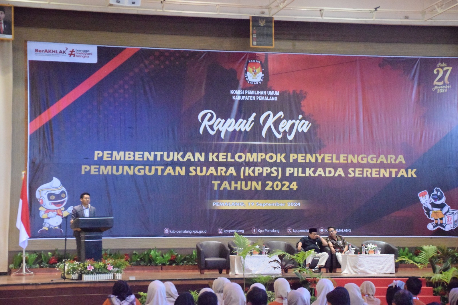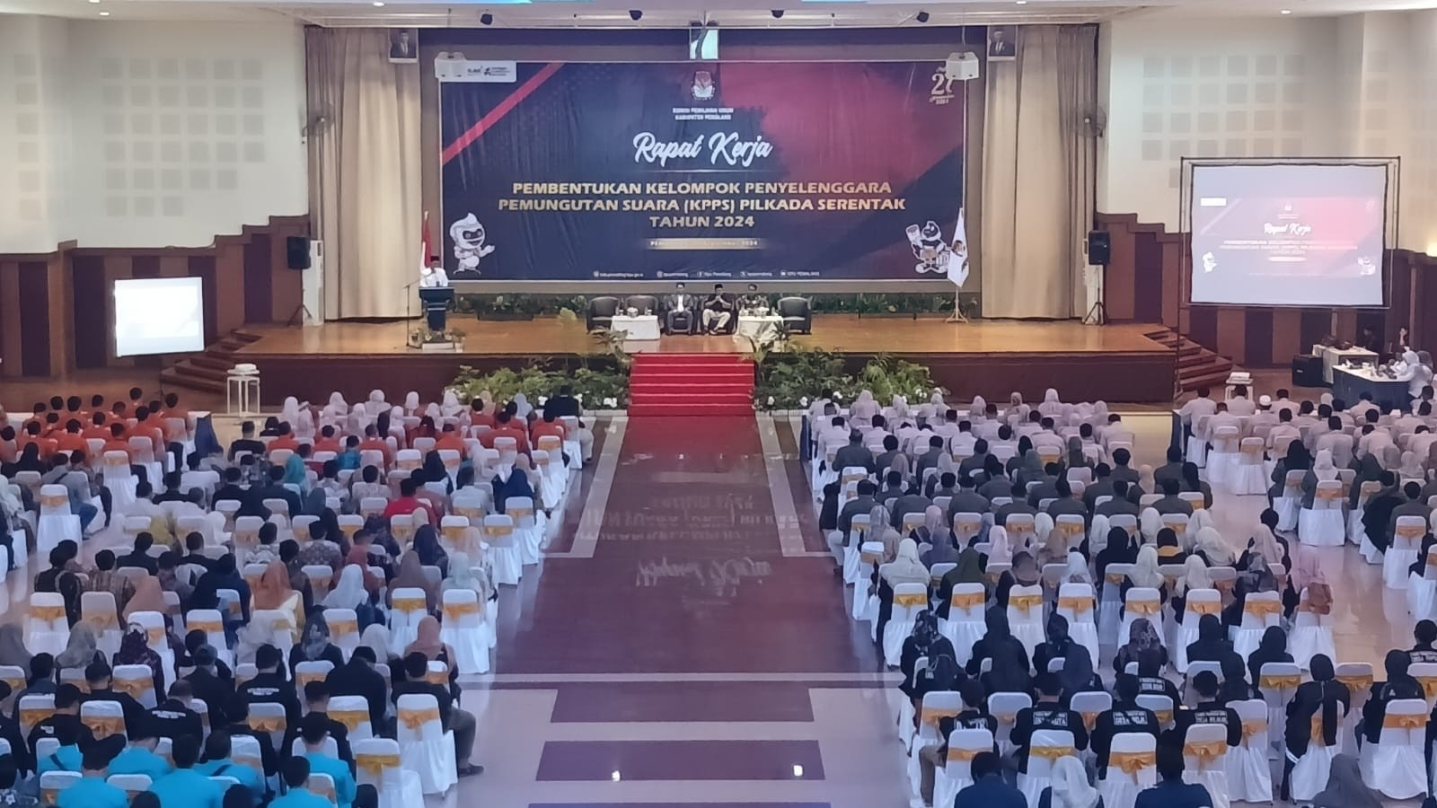 #TemanPemilih, Kamis (19/9/2024) KPU Kabupaten Pemalang menyelenggarakan Rapat Kerja Pembentukan Kelompok Penyelenggara Pemungutan Suara (KPPS) Pilkada Serentak Tahun 2024 bertemepat di Hotel R-Gina Pemalang turut hadir dalam acara tersebut yaitu Bawaslu, Ketua PPK,anggota PPK Divisi SDM dan seluruh PPS se-Kabupaten Pemalang. Acara dibuka oleh Ketua KPU Kabupaten Pemalang Agus Setiyanto dalam sambutannya menyampaiakan "belajar dari pengalaman saat Pemilu 2024 lalu,dimana terjadi PSU di empat lokasi di Kecamatan Comal, saya berharap hal tersebut tidak terjadi lagi. Untuk itu saya berpesan pada seluruh PPK dan PPS agar merkrut KPPS yang berkualitas agar tidak terjadi kesalahan yang sama.
