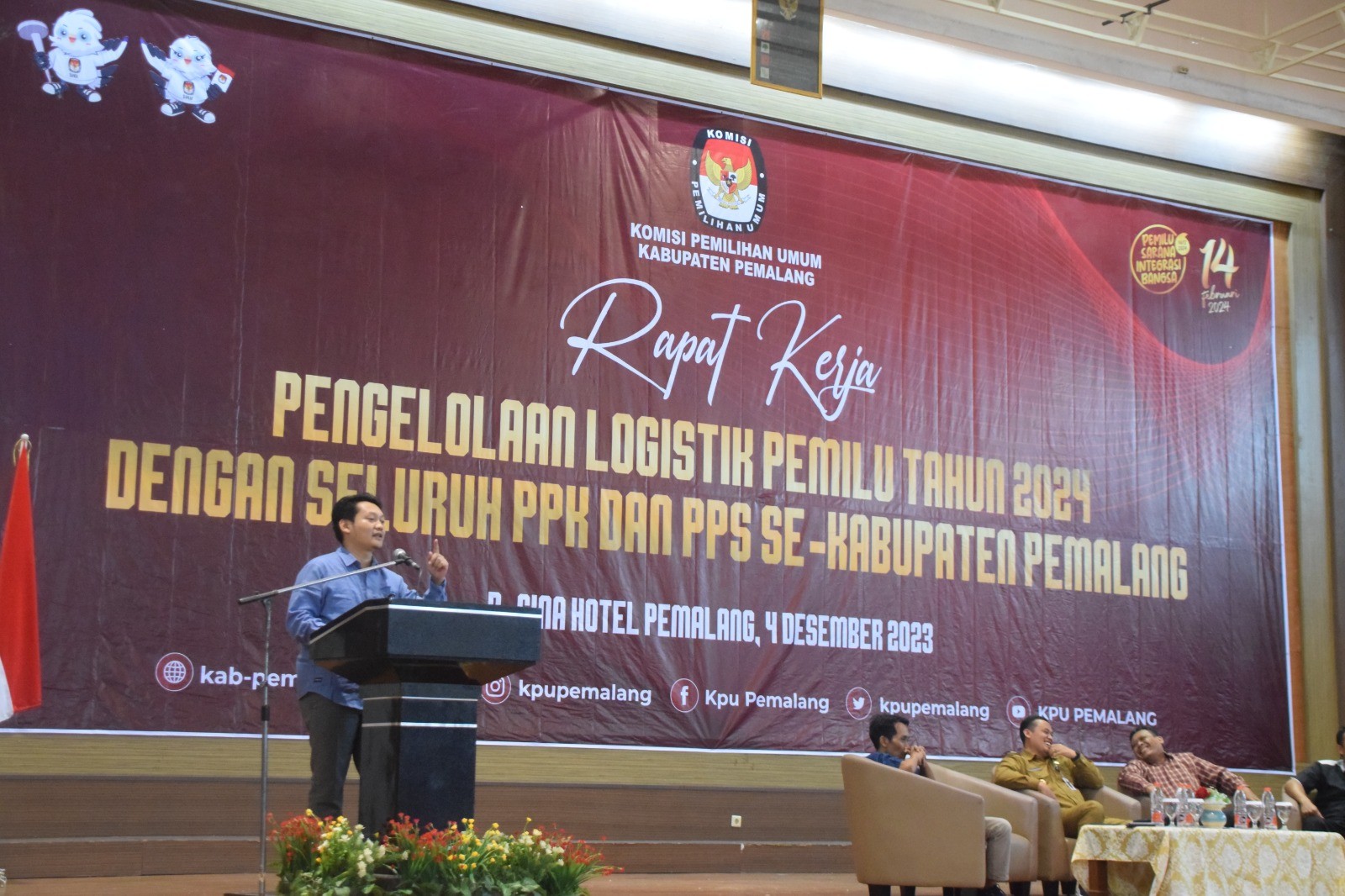 KPU Pemalang menggelar rapat kerja Pengelolaan Logistik Pemilu Tahun 2024 dengan peserta seluruh PPK dan PPS se-Kabupaten Pemalang, Senin (04/12/2024) pukul 13.00 WIB di Hotel Regina Pemalang. Turut hadir sebagai narasumber yakni Bupati pemalang, H. Mansur Hidayat, S.T.