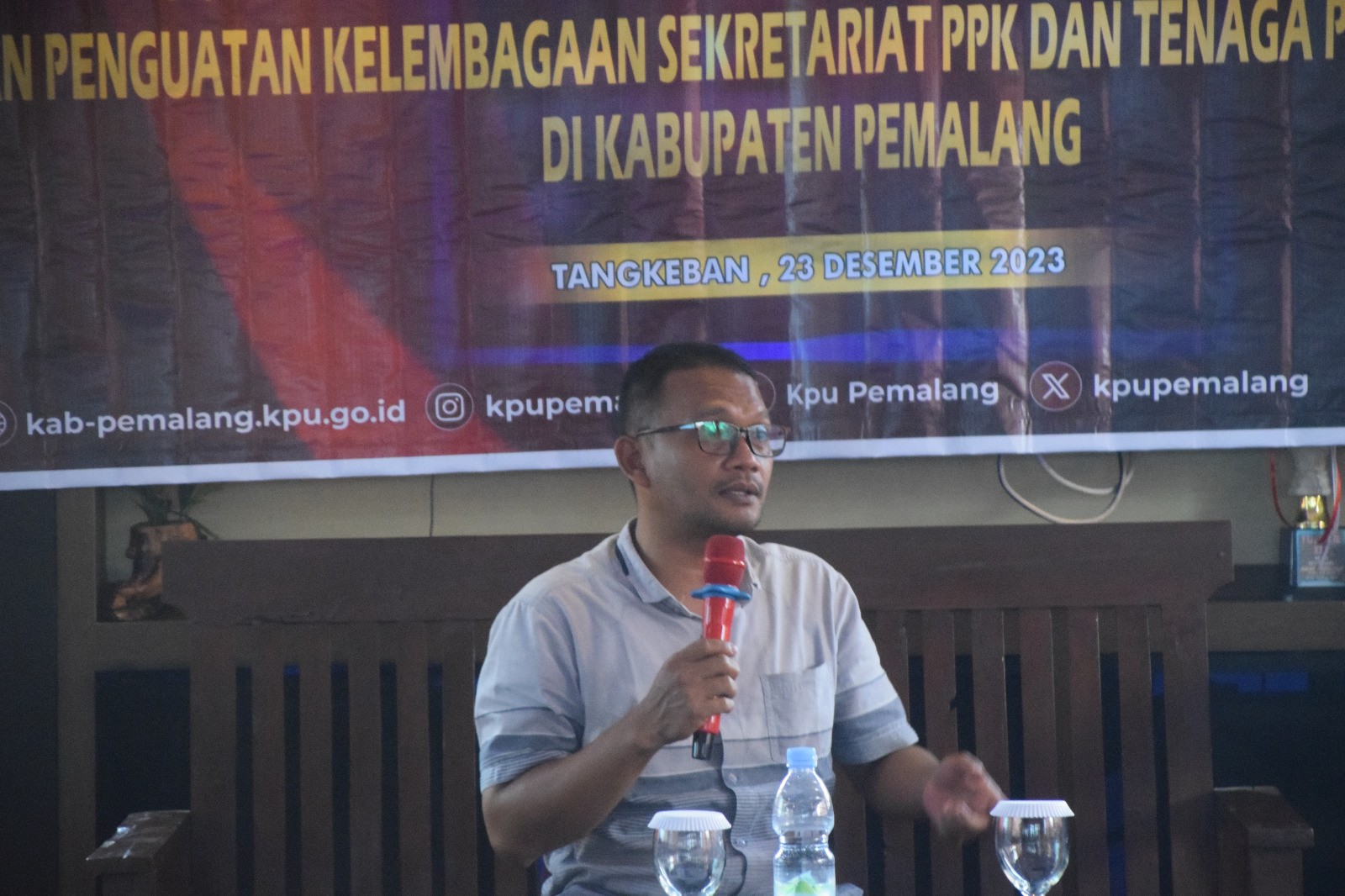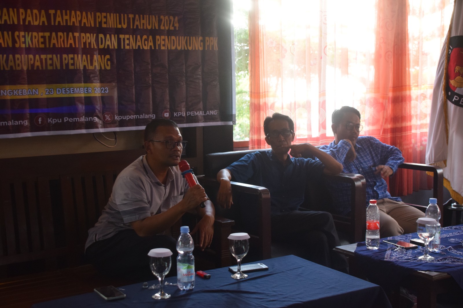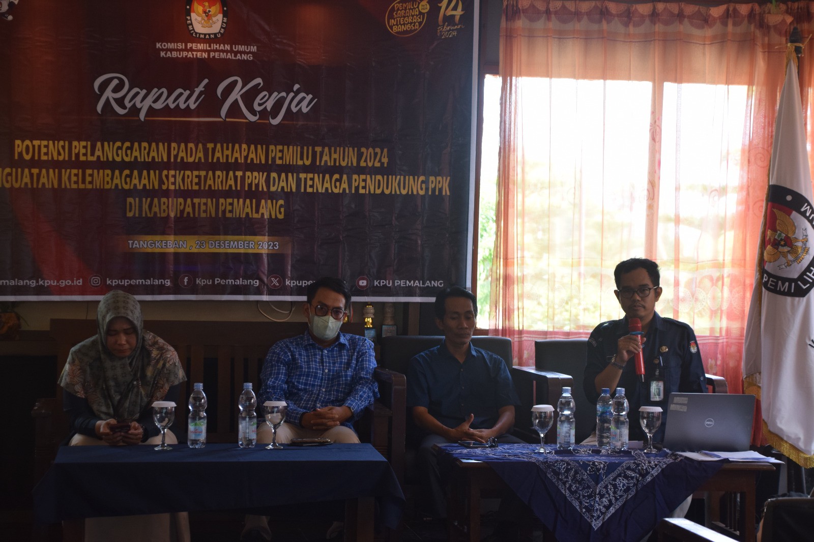 KPU Kabupuaten Pemalang menggelar Rapat Kerja Potensi Pelanggatan pada Tahapan Pemilu Tahun 2024 dan Penguatan Kelembagaaan Sekretariat PPK, Sabtu (23/12/2023) pukul 09.00 WIB di Bukit Tangkeban Pulosari. Raker dibuka oleh Anggota KPU Supriyanto. Kemudian raker tersebut dibagi kedalam 2 sesi. Sesi yang pertama yakni penguatan kelembagaan Sekretariat PPK dengan peserta Sekretaris PPK beserta Staf dan Tenaga Pendukung PPK se-Kabupaten Pemalang. Sesi kedua yakni Rapat Kerja Potensi Pelanggatan pada Tahapan Pemilu Tahun 2024 dengan peserta PPK se-Kabupaten Pemalang.