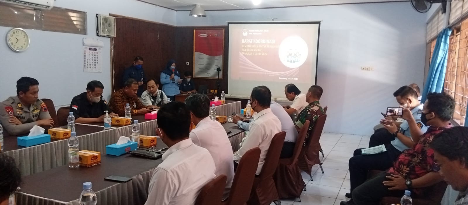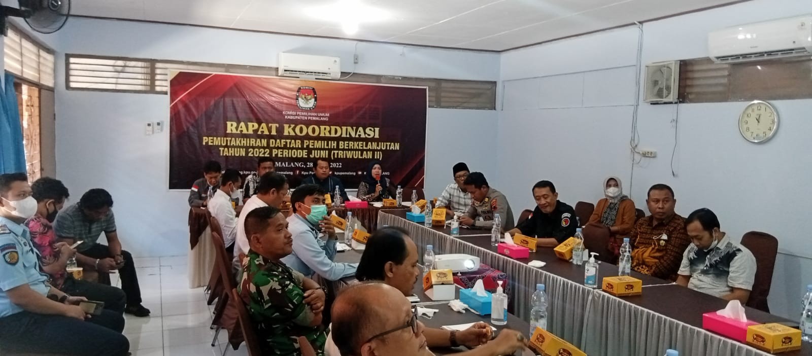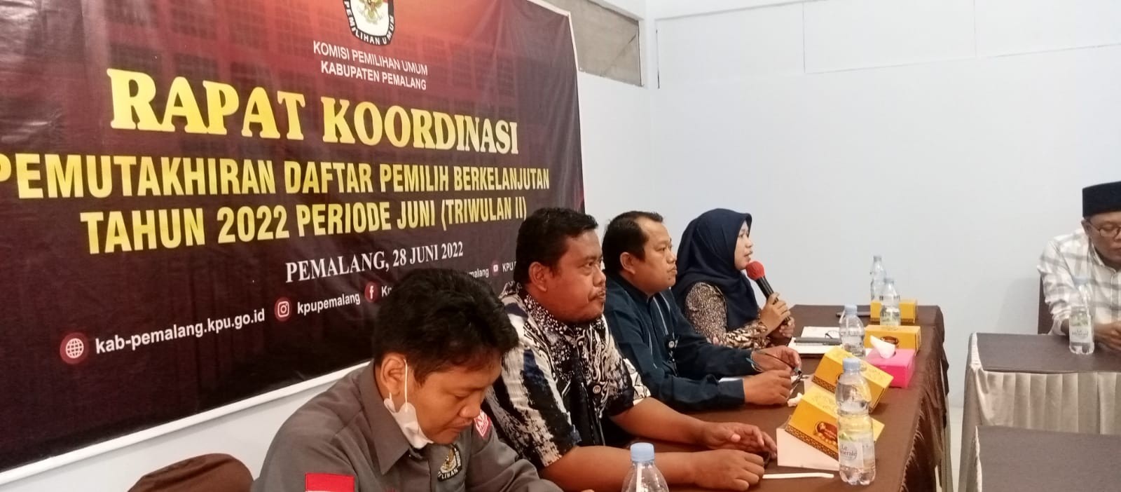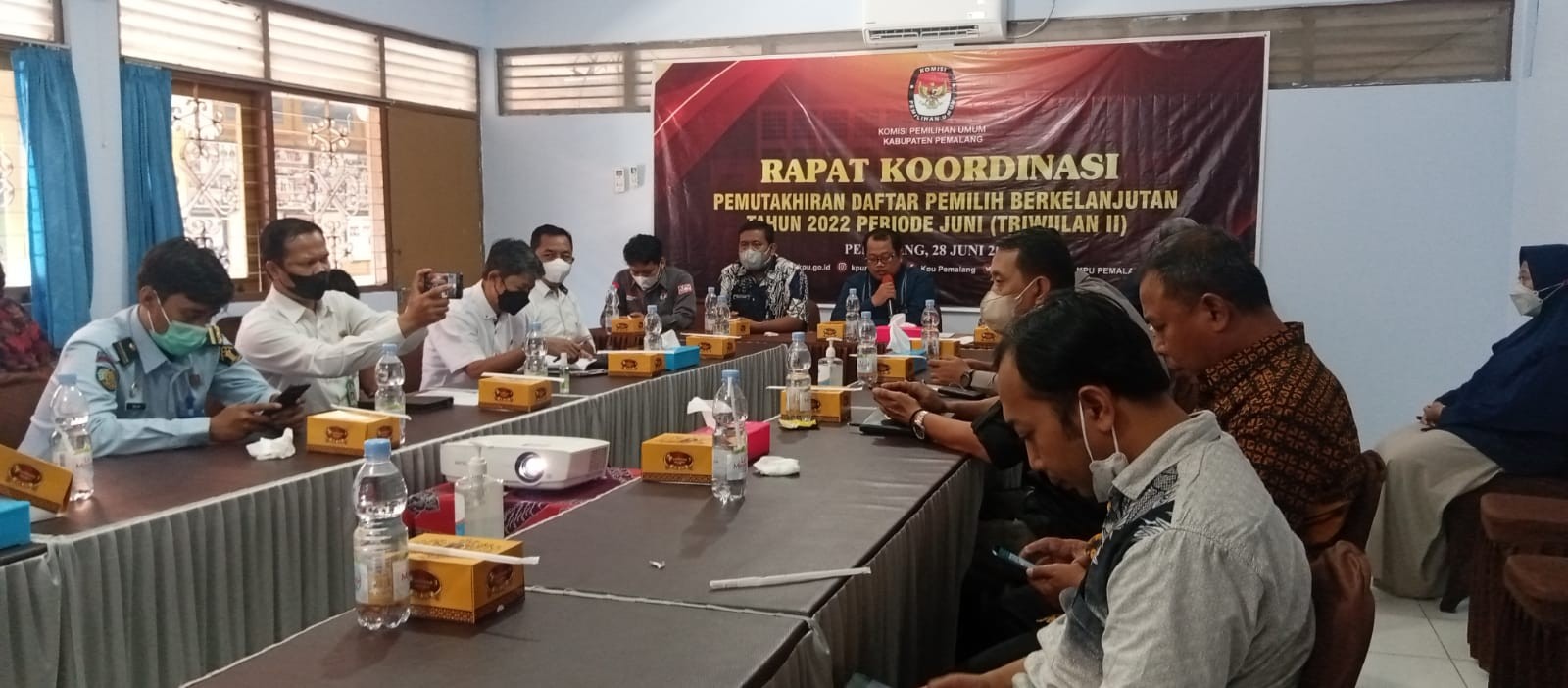 Senin, 28 Juni 2022 Pukul 10.00 WIB Komisi Pemilihan Umum Kabupaten Pemalang melaksanakan Rapat Koordinasi Pemutakhiran Daftar Pemilih Berkelanjutan Periode Bulan Juni 2022 di ruang rapat KPU Kabupaten Pemalang Rakor dihadiri oleh Ketua dan Anggota KPU Kabupaten Pemalang, Polres Pemalang, Kodim 7011 Pemalang, Bawaslu, Badan Kesbangpol, Dispermades, Kemenag, Rutan Pemalang, Cabdin Wilayah XII Dinas Pendidikan Provinsi Jawa Tengah, serta Partai Politik se Kabupaten Pemalang.