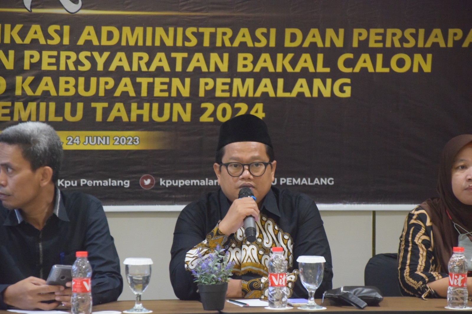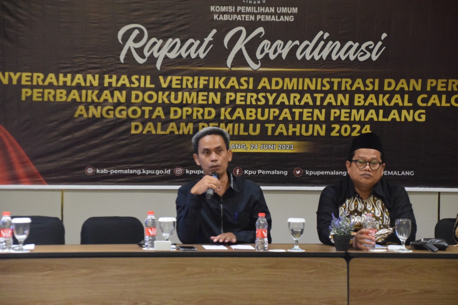 KPU Kabupaten Pemalang melaksanakan Rapat Koordinasi Penyerahan Hasil Verifikasi Administrasi dan Persiapan Perbaikan Dokumen Bakal Calon Angota DPRD Kabupaten Pemalang dalam Pemilu Tahun 2024 di Hotel Grand Wijaya Pemalang, Sabtu (24/06/2023). Hadir pada kegiatan tersebut Forkopimda, Dinas/Instansi, Bawaslu, serta Partai Politik se-Kabupaten Pemalang.