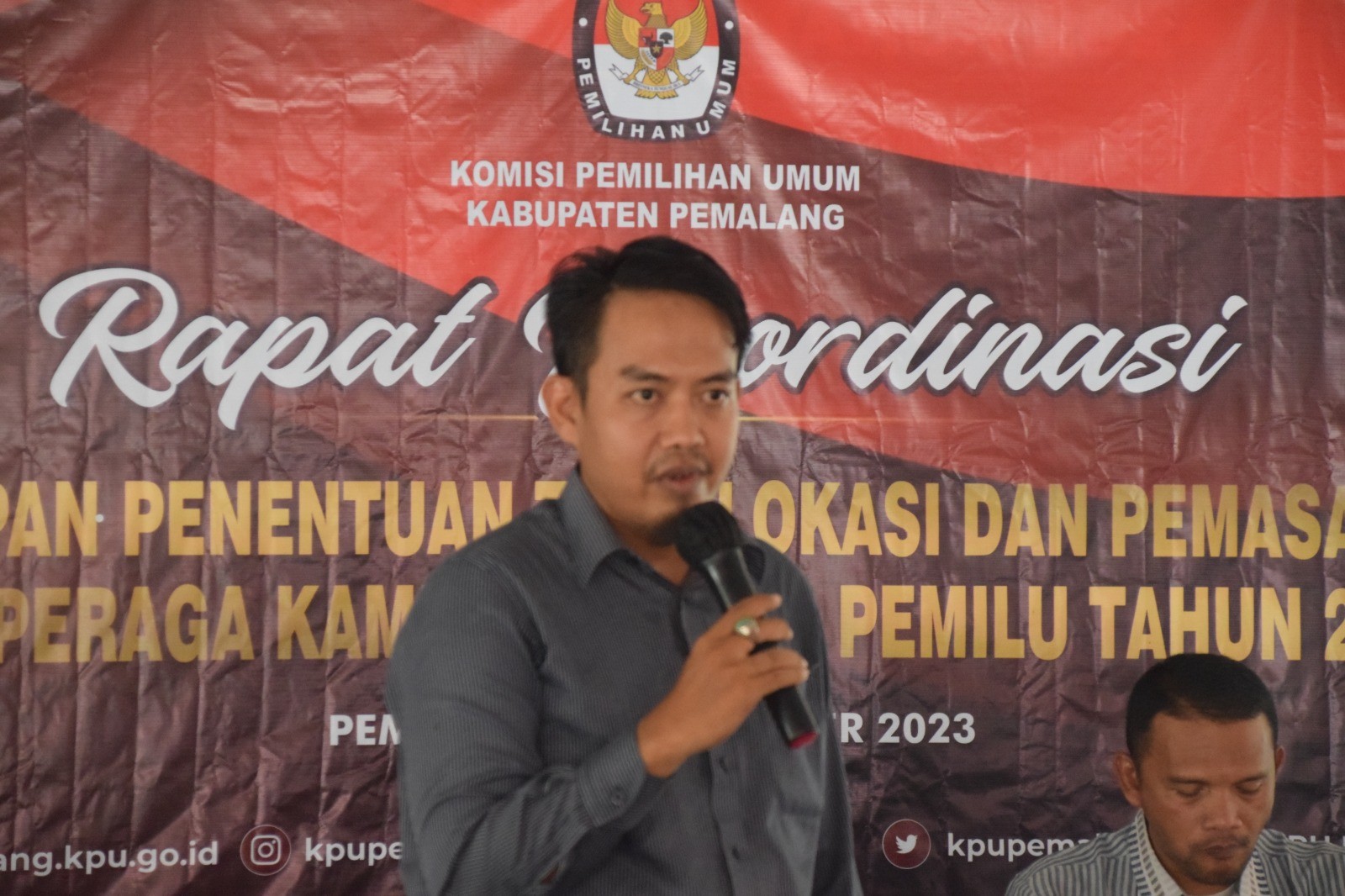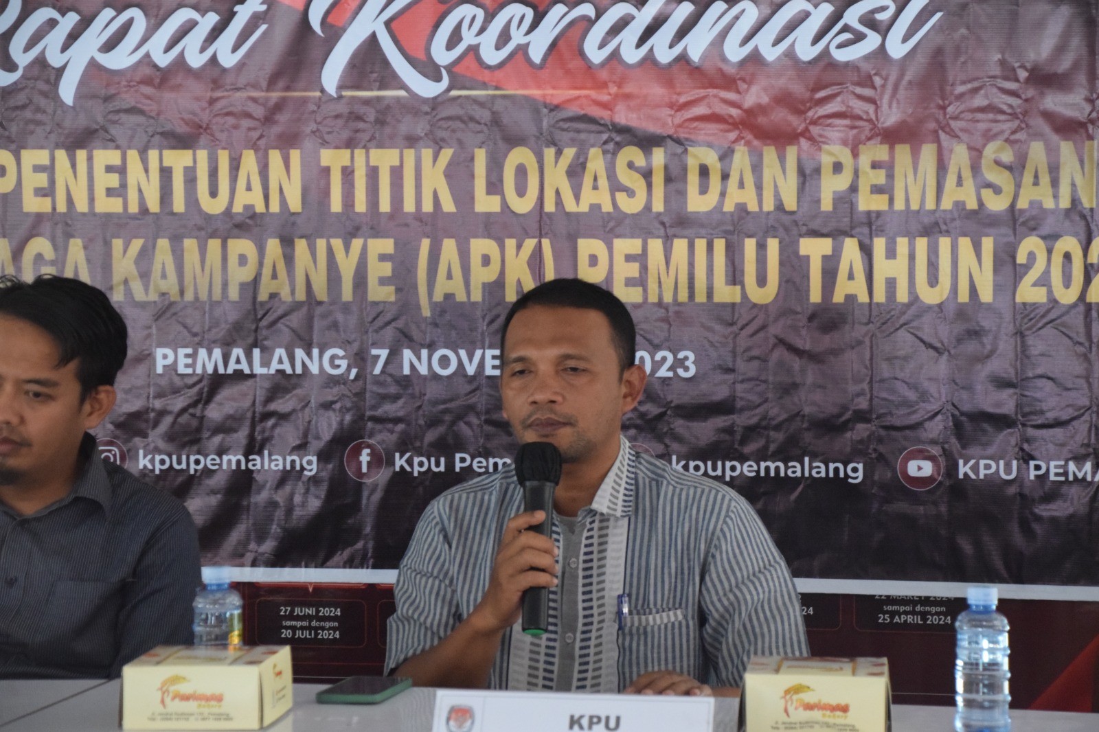 KPU Kabupaten Pemalang menyelenggarakan Rapat Koordinasi Persiapan Penentuan Titik Lokasi dan Pemasangan Alat Peraga Kampanye (APK) Pemilu Tahun 2024, Selasa (07/11/2023) pukul 13.00 WIB di Pendopo KPU Kabupaten Pemalang.