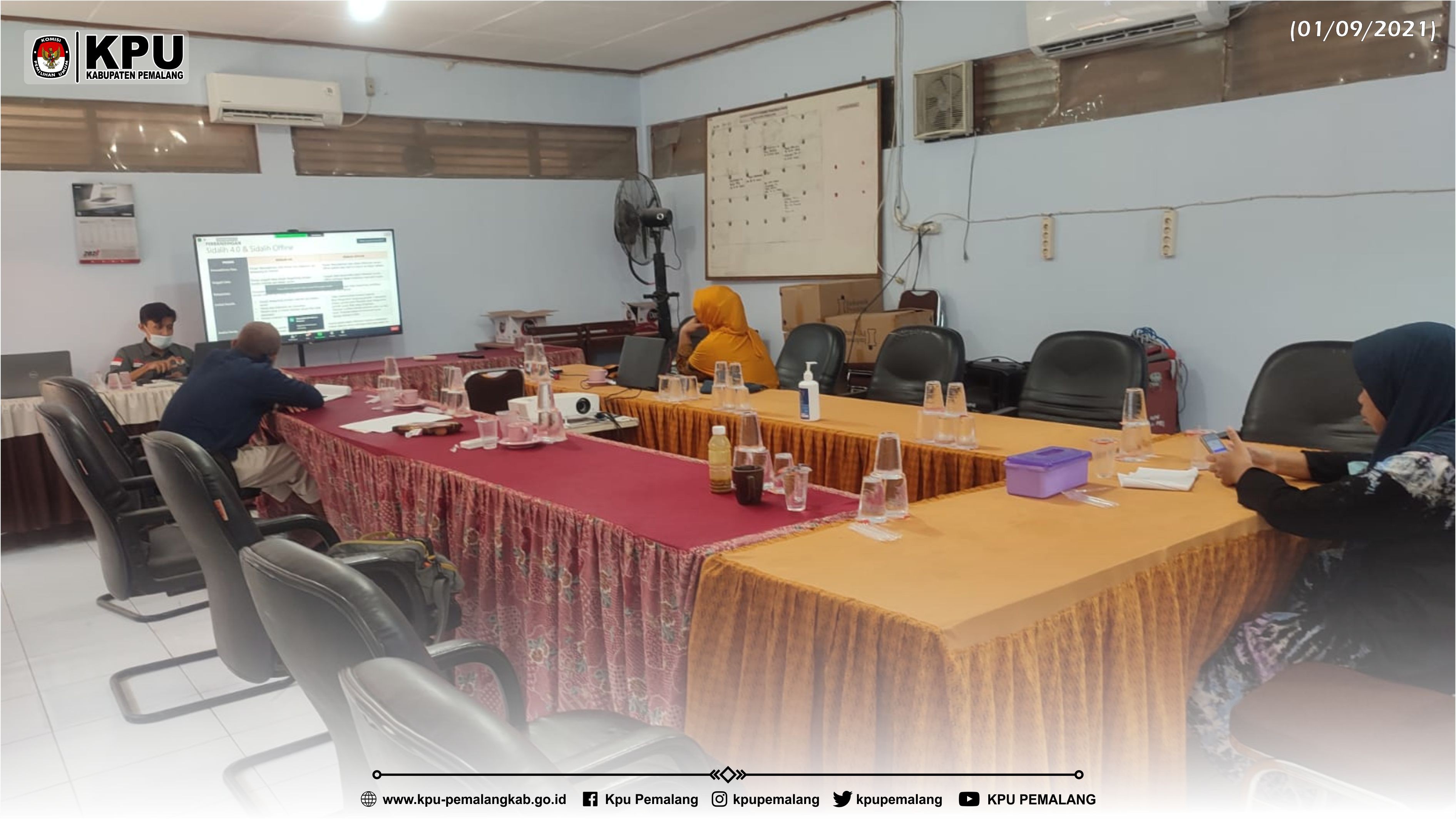 Rabu, 1 September 2021 pukul 13.00 WIB s/d selesai KPU Kabupaten Pemalang mengikuti acara Rapat Koordinasi Sosialisasi Aplikasi Sistem Informasi Data Pemilih (Sidalih) Berkelanjutan dengan KPU Provinsi dan KPU Kabupaten/Kota secara daring yang bertempat di ruang rapat.