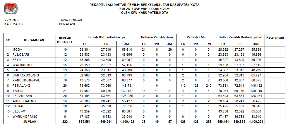 Hasil dari Penetapan Hasil DPB tersebut untuk pemilih laki-laki 559.461 dan perempuan 549.832 total jumlah 1.109.293 pemilih yang tersebar di 14 Kecamatan, dengan rincian sebagai berikut :