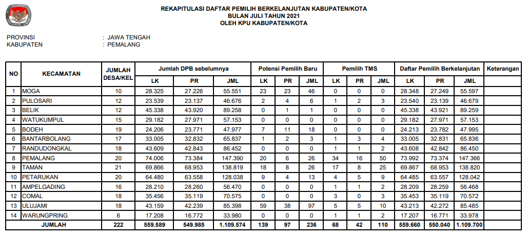 Divisi Perencanaan Data dan Informasi Aida Yunirahmawati dalam rapat pleno internal bulanan KPU Kabupaten Pemalang yang diselenggarakan hari Kamis tanggal 29 Juli 2021 pukul 10.00 WIB di ruang rapat KPU Kabupaten Pemalang jalan A. Yani Selatan Nomor 59 Pemalang menyampaikan laporan hasil Rekapitulasi Daftar Pemilih Berkelanjutan Tahun 2021 Periode Bulan Juli dengan hasil jumlah laki-laki 559.660 dan perempuan 550.040 total jumlah 1.109.700.