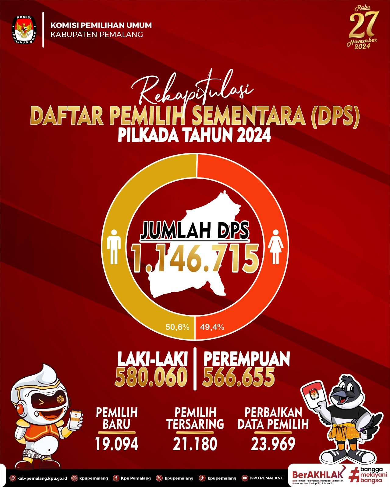 #TemanPemilih, KPU Kabupaten Pemalang menetapkan Daftar Pemilih Sementara Pilkada Serentak Tahun 2024 pada hari Sabtu, 10 Agustus 2024.