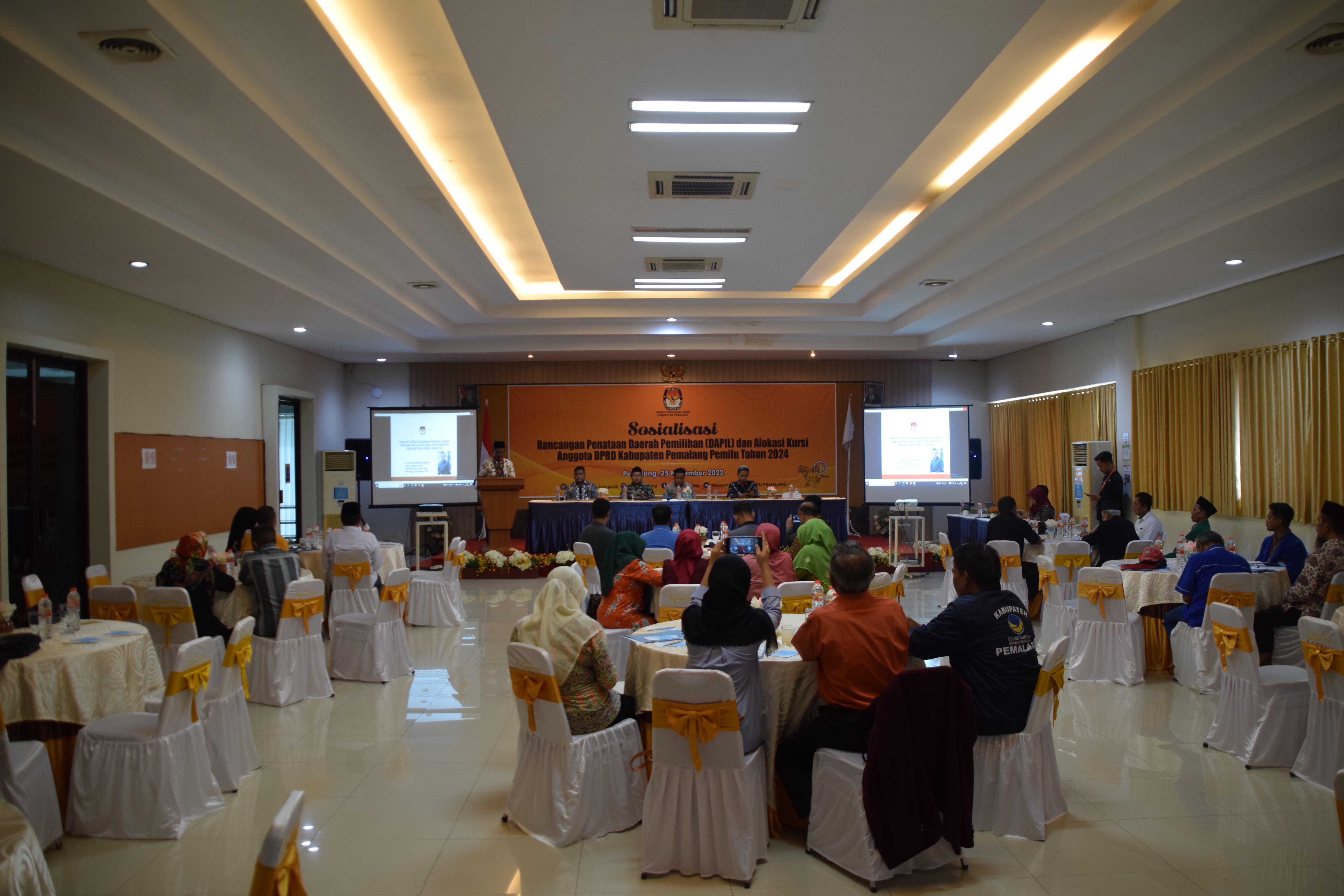 Jum’at 25 November 2022 pukul 14.00 WIB, KPU Kabupaten Pemalang mengadakan Sosialisasi Rancangan Penataan Daerah Pemilihan (DAPIL) dan Alokasi Kursi Anggota DPRD Kabupaten Pemalang pada Pemilu 2024. Bertempat di Hotel Regina Pemalang dengan peserta Forkopimda, Organisasi Masyarakat, dan Partai Politik se Kabupaten Pemalang.