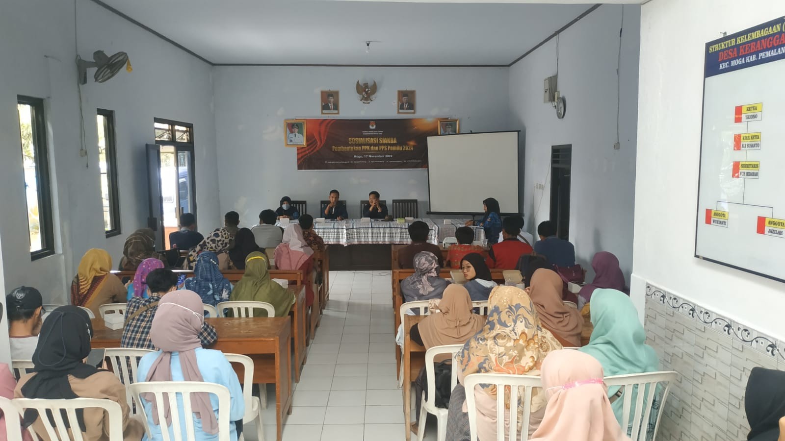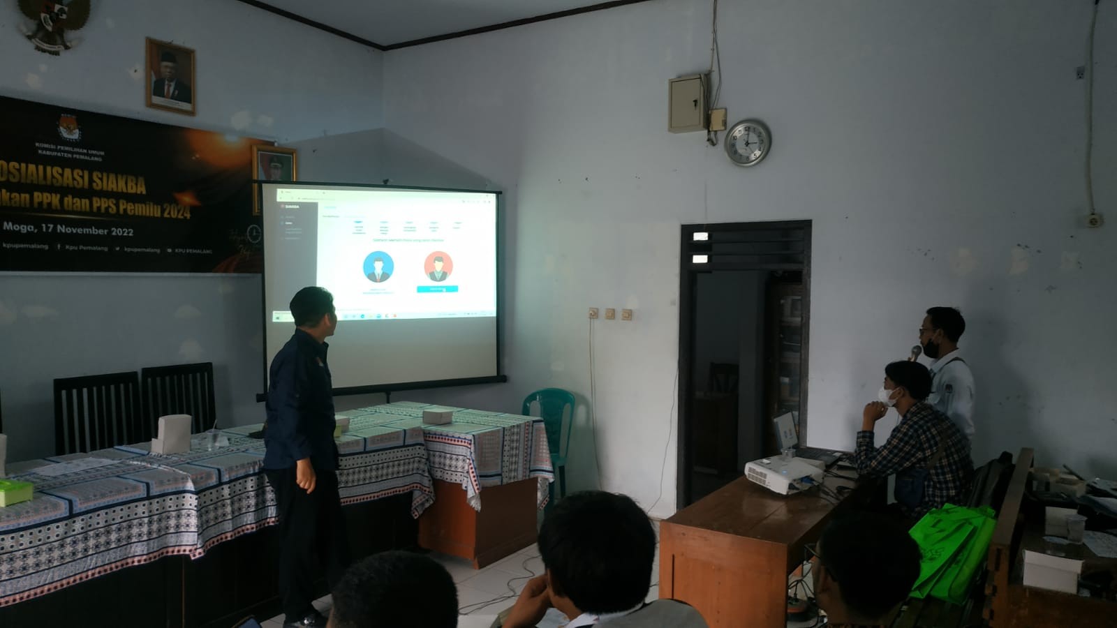 Kamis 17 November 2022 pukul 14.00, KPU Kabupaten Pemalang melaksanakan sosialisasi Siakba untuk calon pendaftar PPK dan PPS di Kabupaten Pemalang, khususnya di Kecamatan Moga. Bertempat di Balai Desa Kebanggan, Kecamatan Moga dengan peserta calon pendaftar PPK dan PPS di Kecamatan Moga. Peserta diberikan simulasi oleh Agus Setiyanto (Anggota KPU divisi Sosdiklih Parmas dan SDM) terkait alur pendaftaran PPK dan PPS melalui aplikasi Siakba.