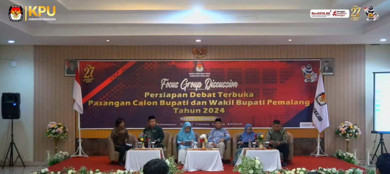 PEMALANG- Komisi Pemilihan Umum (KPU) Kabupaten Pemalang menyelenggarakan Focus Group Discussion (FGD) bertajuk Persiapan Debat Terbuka Pasangan Calon Bupati dan Wakil Bupati Pemalang Tahun 2024 pada Sabtu, 19 Oktober 2024, bertempat di R-Gina Hotel Pemalang. Kegiatan ini digelar sebagai bagian dari upaya untuk memastikan pelaksanaan debat terbuka berlangsung secara berkualitas, berimbang, dan mencerminkan nilai-nilai demokrasi yang substantif. Dalam FGD tersebut, KPU menghadirkan berbagai tokoh penting dari kalangan akademisi, organisasi masyarakat, dan unsur pemerintah daerah sebagai narasumber. Adapun para narasumber yang hadir antara lain: Ketua PCNU Kabupaten Pemalang, Kyai Abu Joharudin Bahry Kepala Badan Kesatuan Bangsa dan Politik (Bakesbangpol) Kabupaten Pemalang, Bagus Sutopo, S.STP., M.AP. Sekretaris Dinas Pendidikan dan Kebudayaan (Dindikbud) Kabupaten Pemalang, Dra. Titien Soewastiningsih Soebari, M.Ed., Ph.D. Rektor Institut Agama Islam Pemalang, Dr. Hj. Amiroh, M.Ag Ketua PD Muhammadiyah Kabupaten Pemalang, Ust. Sapto Suhendro, S.Ag., M.Pd. Diskusi berlangsung hangat dan konstruktif, membahas sejumlah aspek penting yang akan menjadi dasar penyusunan tema dan substansi debat, termasuk isu pendidikan, sosial-keagamaan, kebangsaan, serta arah pembangunan daerah. FGD ini juga menjadi wadah untuk menyerap masukan dari berbagai elemen masyarakat demi menciptakan debat terbuka yang informatif, berintegritas, dan mampu menjadi referensi bagi pemilih dalam menentukan pilihan pada Pilkada yang akan digelar akhir tahun ini. Dengan terselenggaranya kegiatan ini, KPU Pemalang berharap debat pasangan calon tidak hanya menjadi ajang adu gagasan, tetapi juga dapat meningkatkan partisipasi pemilih serta kualitas demokrasi lokal di Kabupaten Pemalang.