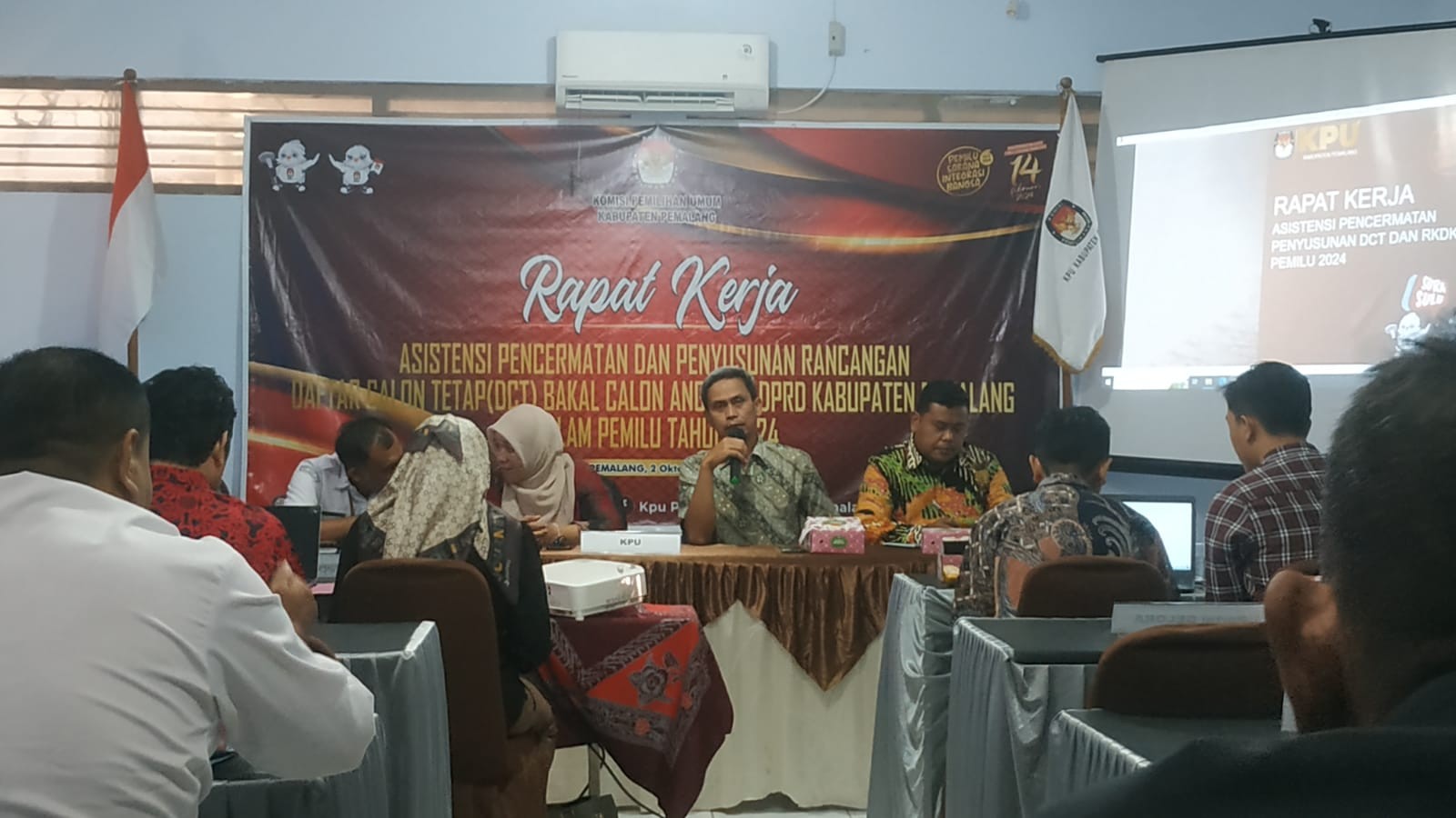 KPU Kabupaten Pemalang menyelenggarakan Rapat Kerja Asistensi Pencermatan dan Penyusunan Rancangan Daftar Calon Tetap (DCT) Anggota DPRD Kabupaten Pemalang, Senin (02/10/2023) pukul 10.00 WIB. Bertempat di Ruang Rapat KPU Pemalang, hadir pada raker tersebut Bawaslu Kabupaten Pemalang serta Partai Politik Peserta Pemilu Tahun 2024 di Kabupaten Pemalang. Raker dibuka oleh Plt. Ketua KPU Aida Yunirahmawati, dilanjutkan dengan penyampaian materi oleh Anggota KPU Harun Gunawan. Beliau menyampaikan materi terkait pencermatan DCT dan juga disampaikan pula terkait dengan rekening khusus dana kampanye bagi partai politik peserta pemilu.