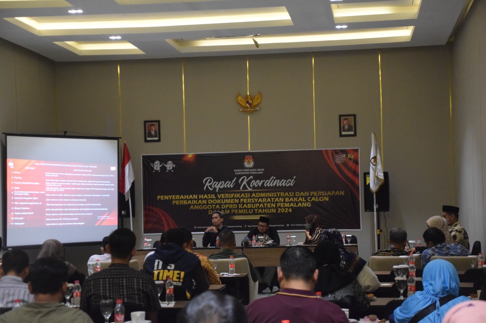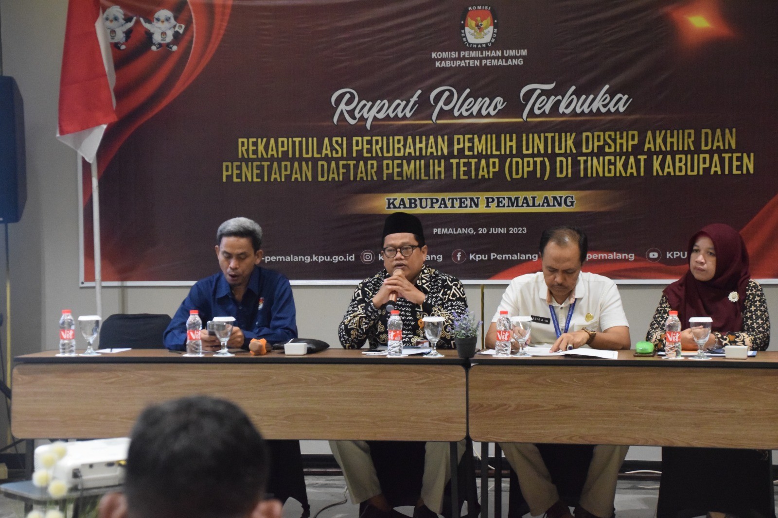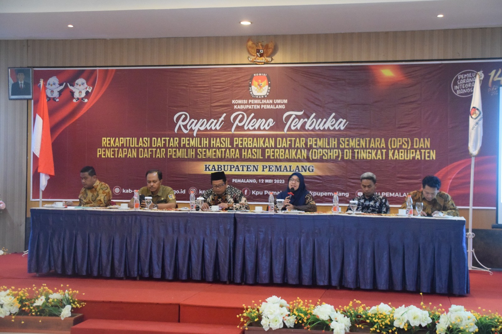 KPU Kabupaten Pemalang melaksanakan Rapat Pleno Terbuka Rekapitulasi Hasil Perbaikan Daftar Pemilih Sementara (DPS) dan Penetapan Daftar Pemilih Sementara Hasil Perbaikan (DPSHP) Tingkat Kabupaten/Kota pada Pemilu Tahun 2024 di Hotel Regina Pemalang, Jumat (12/05/2023). Hadir pada kegiatan tersebut Forkopimda, Dinas/Instansi, Bawaslu, Partai Politik, serta PPK se-Kabupaten Pemalang.