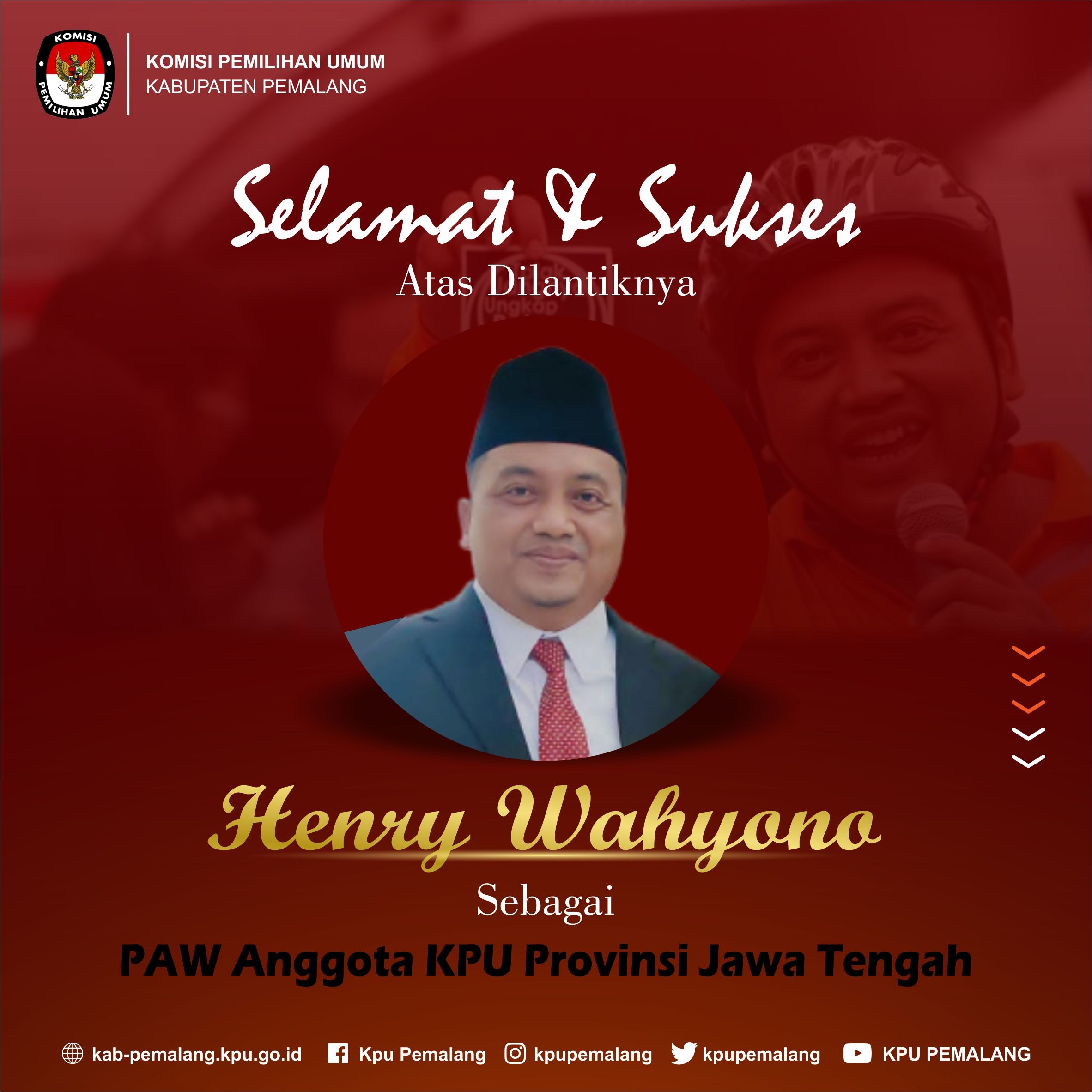 Jajaran KPU Kabupaten Pemalang mengucapkan Selamat dan Sukses atas Dilantiknya Henry Wahyono, S.Pd., M.Sos sebagai Anggota KPU Provinsi Jawa Tengah Periode Tahun 2018 - 2023. Semoga amanah dalam menjalankan tugas.