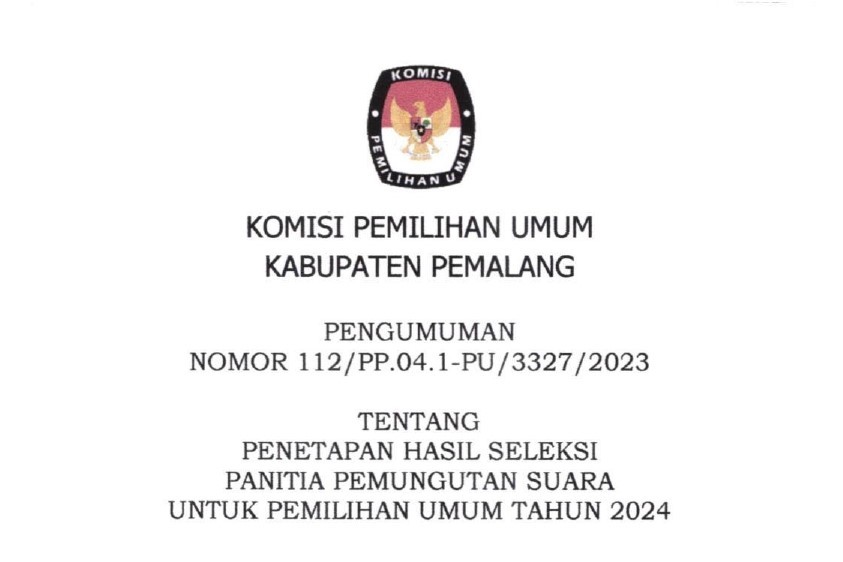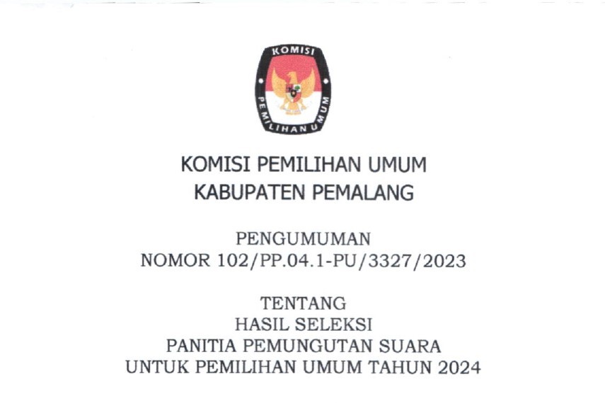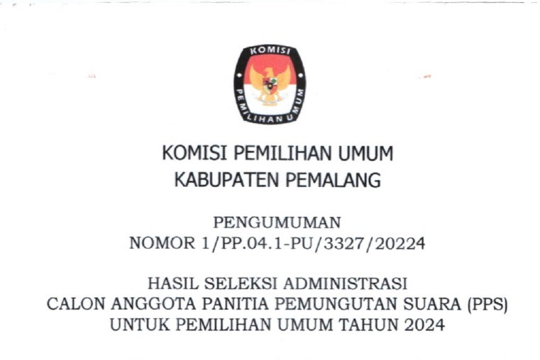 Pengumuman Penetapan Hasil Seleksi Panitia Pemungutan Suara (PPS) untuk Pemilihan Umum Tahun 2024 Jumat, 20 Januari 2023 15:00 753 Untuk pengumuman lengkap Klik disini Baca Selengkapnya