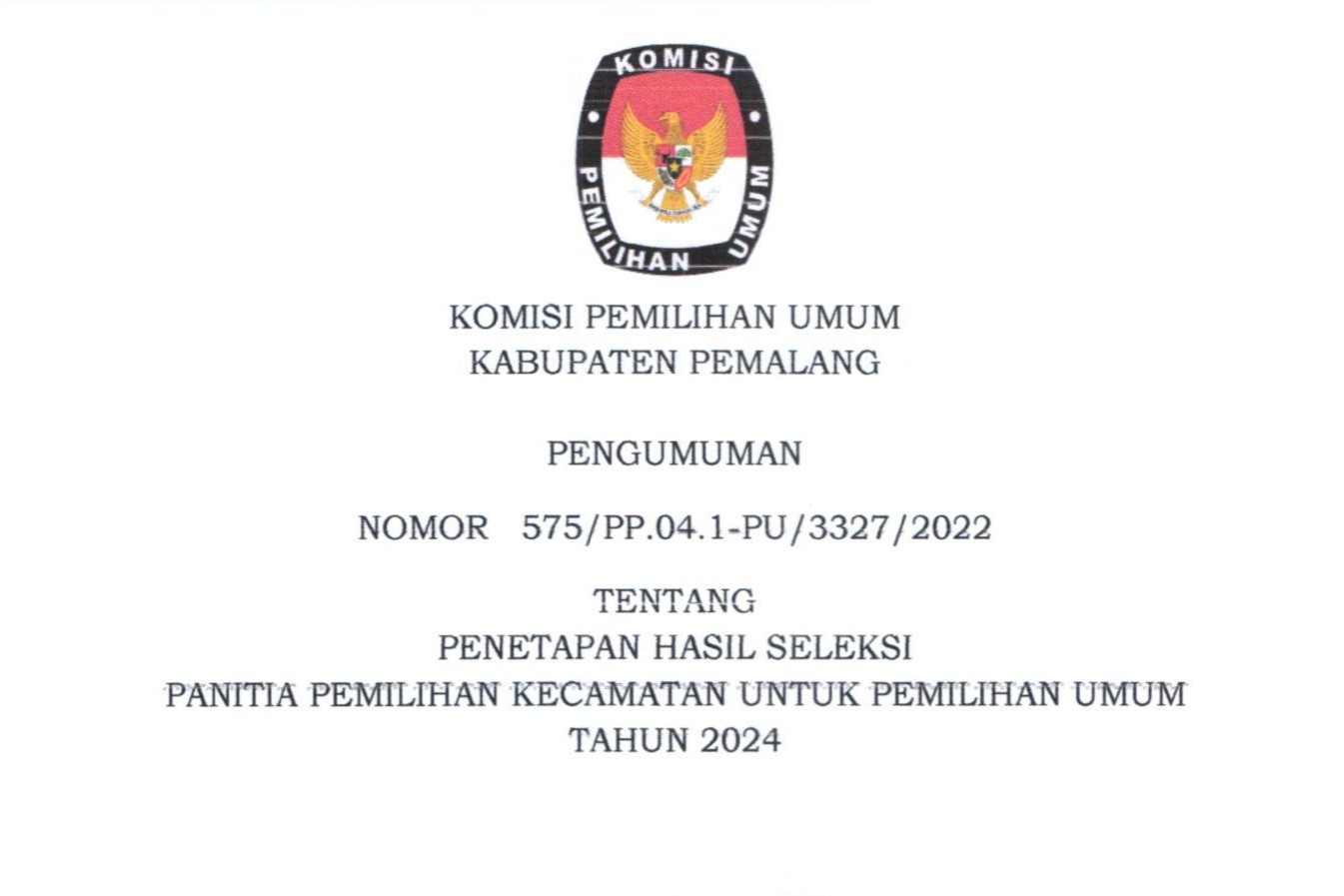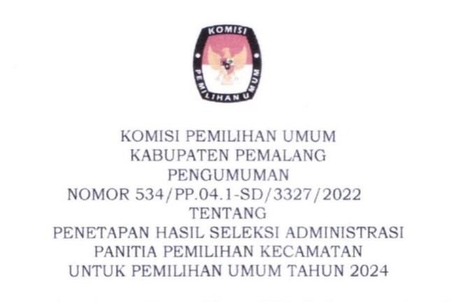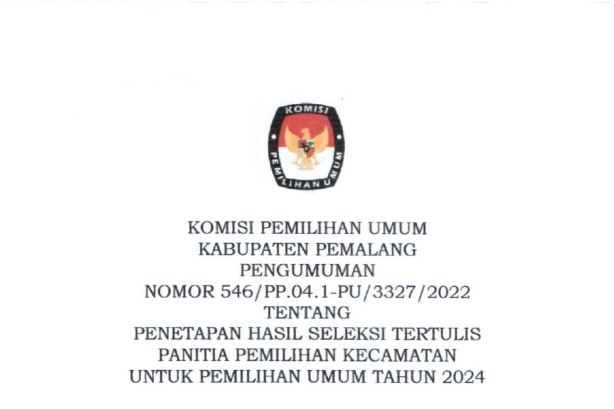 Pengumuman Penetapan Hasil Seleksi Administrasi Panitia Pemilihan Kecamatan untuk Pemilihan Umum Tahun 2024 Kamis, 01 Desember 2022 23:06 1296 Untuk pengumuman lengkap Baca Selengkapnya