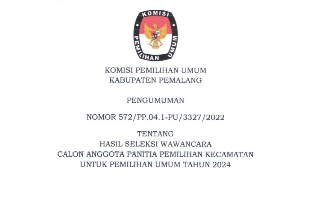 Pengumuman Hasil Seleksi Wawancara Panitia Pemilihan Kecamatan untuk Pemilihan Umum Tahun 2024 Rabu, 14 Desember 2022 03:43 809 Untuk pengumuman lengkap Baca Selengkapnya