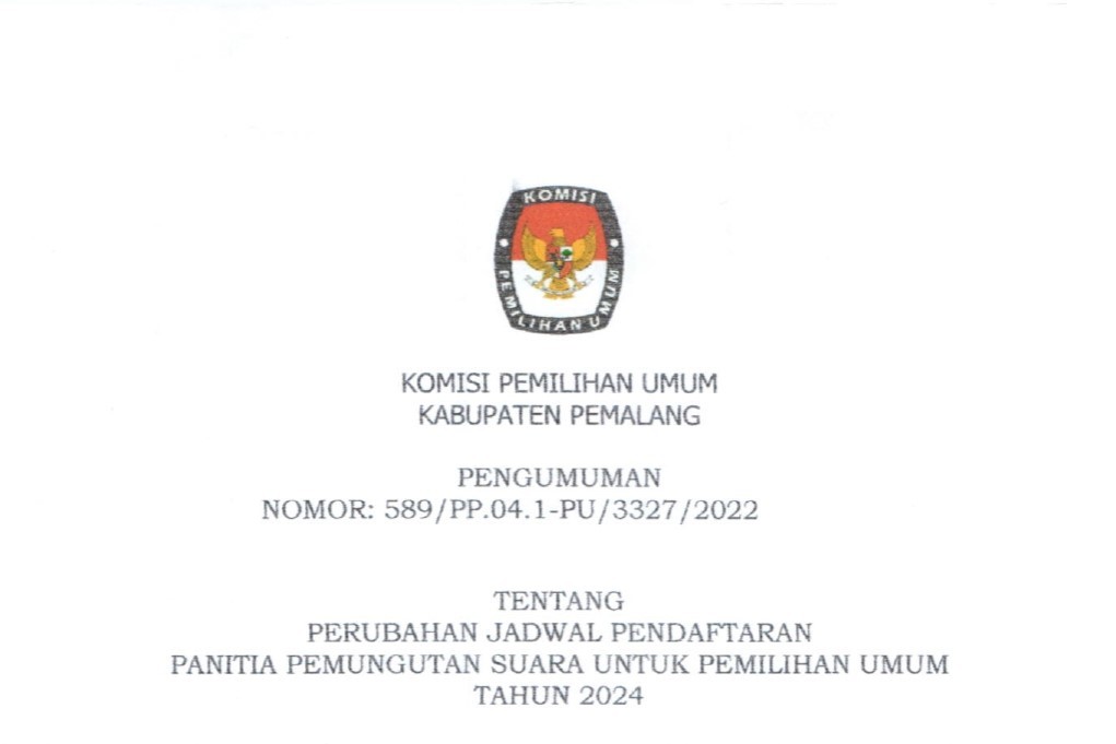 Pengumuman Perubahan Jadwal Pendaftaran Panitia Pemungutan Suara Untuk Pemilihan Umum Tahun 2024 Sabtu, 24 Desember 2022 02:31 1499 Untuk pengumuman lengkap Baca Selengkapnya