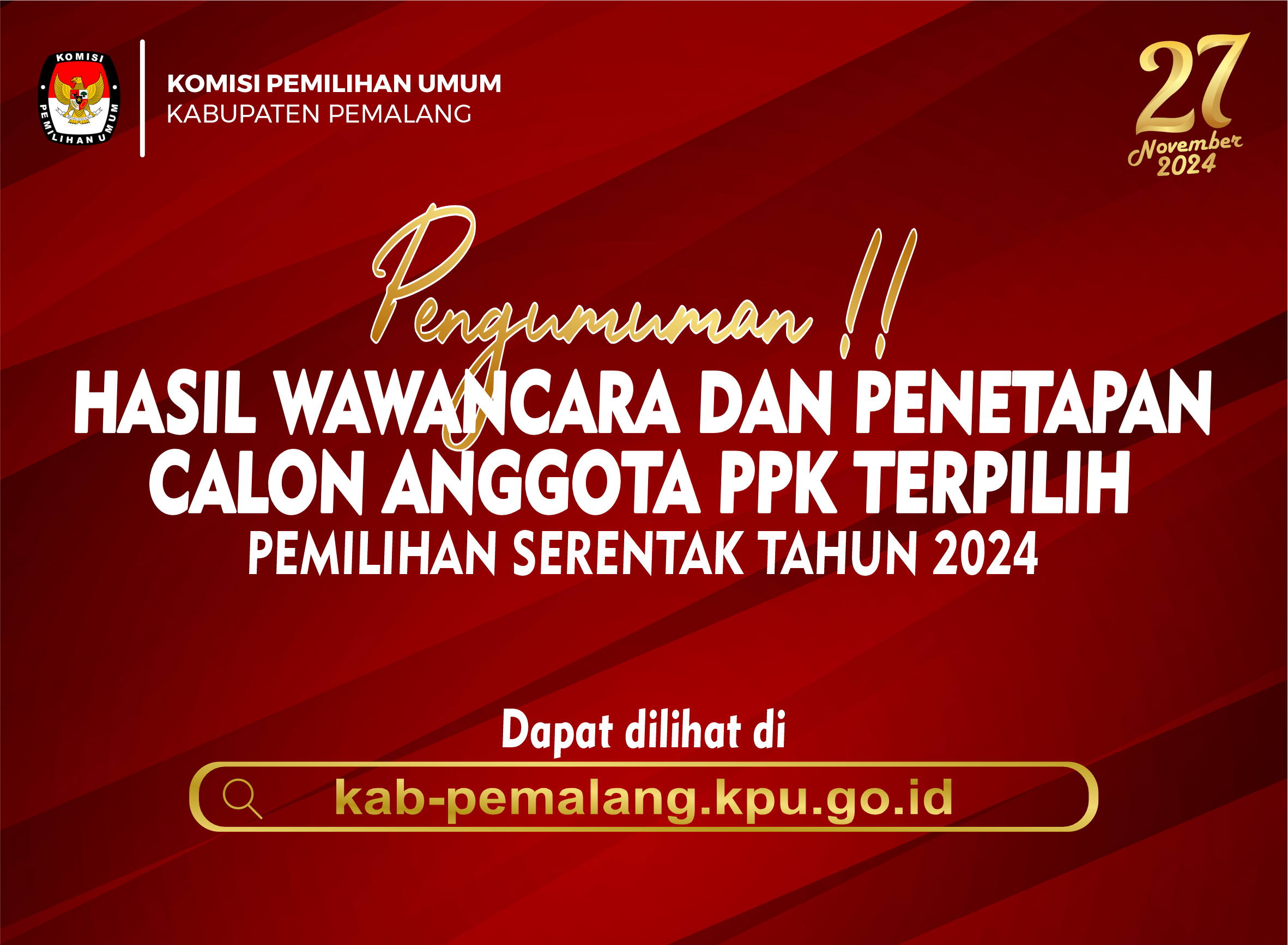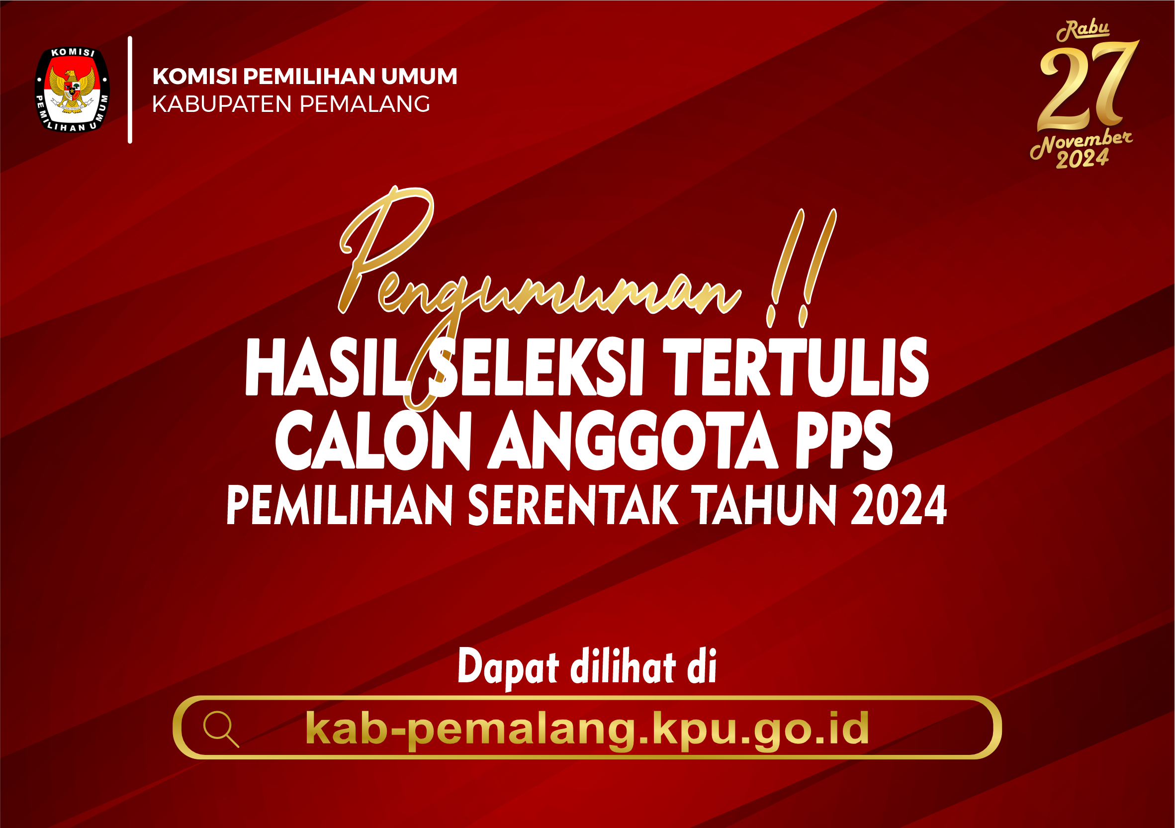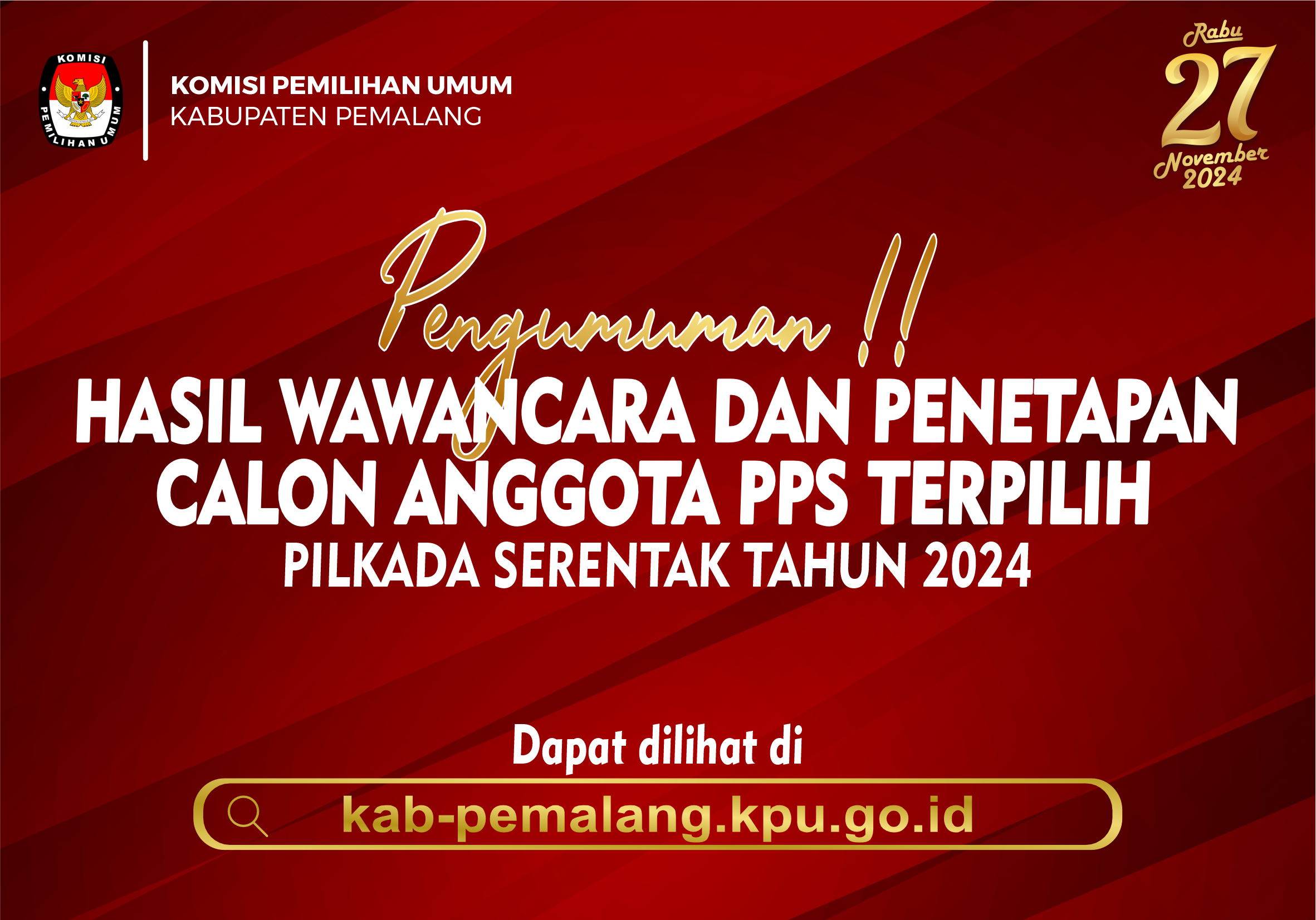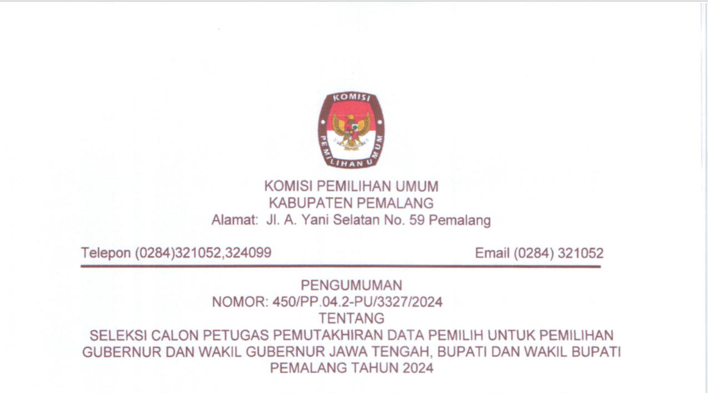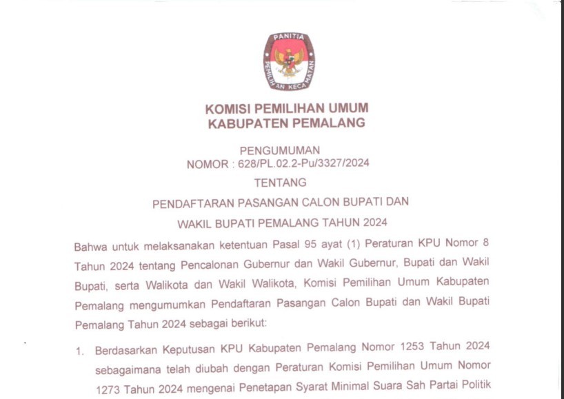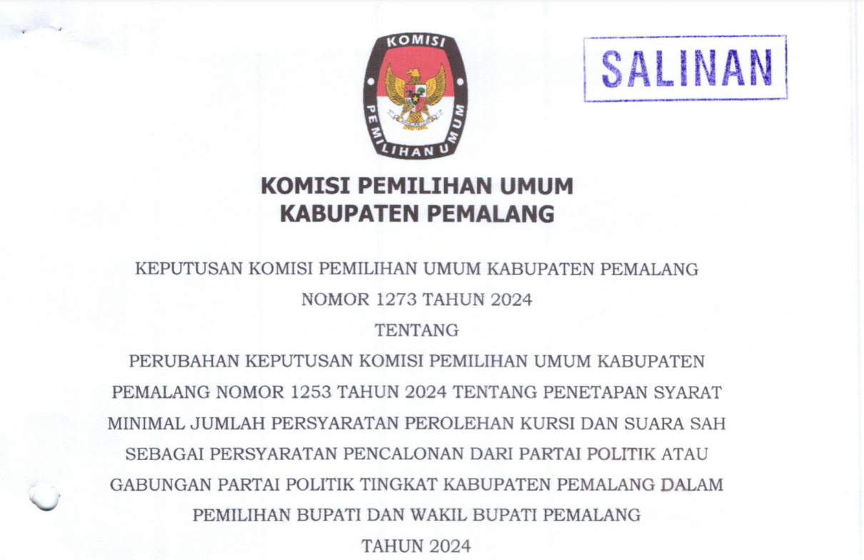 KEPUTUSAN KOMISI PEMILIHAN UMUM KABUPATEN PEMALANG NOMOR I273TAHUN 2024 TENTANG PERUBAHAN KEPUTUSAN KOMISI PEMILIHAN UMUM KABUPATEN PEMALANG NOMOR 1253 TAHUN 2024 TENTANG PENETAPAN SYARAT MINIMAL JUMLAH PERSYARATAN PEROLEHAN KURSI DAN SUARA SAH SEBAGAI PERSYARATAN PENCALONAN DARI PARTAI POLITIK ATAU GABUNGAN PARTAI POLITIK TINGKAT KABUPATEN PEMALANG DALAM PEMILIHAN BUPATI DAN WAKIL BUPATI PEMALANG TAHUN 2024.