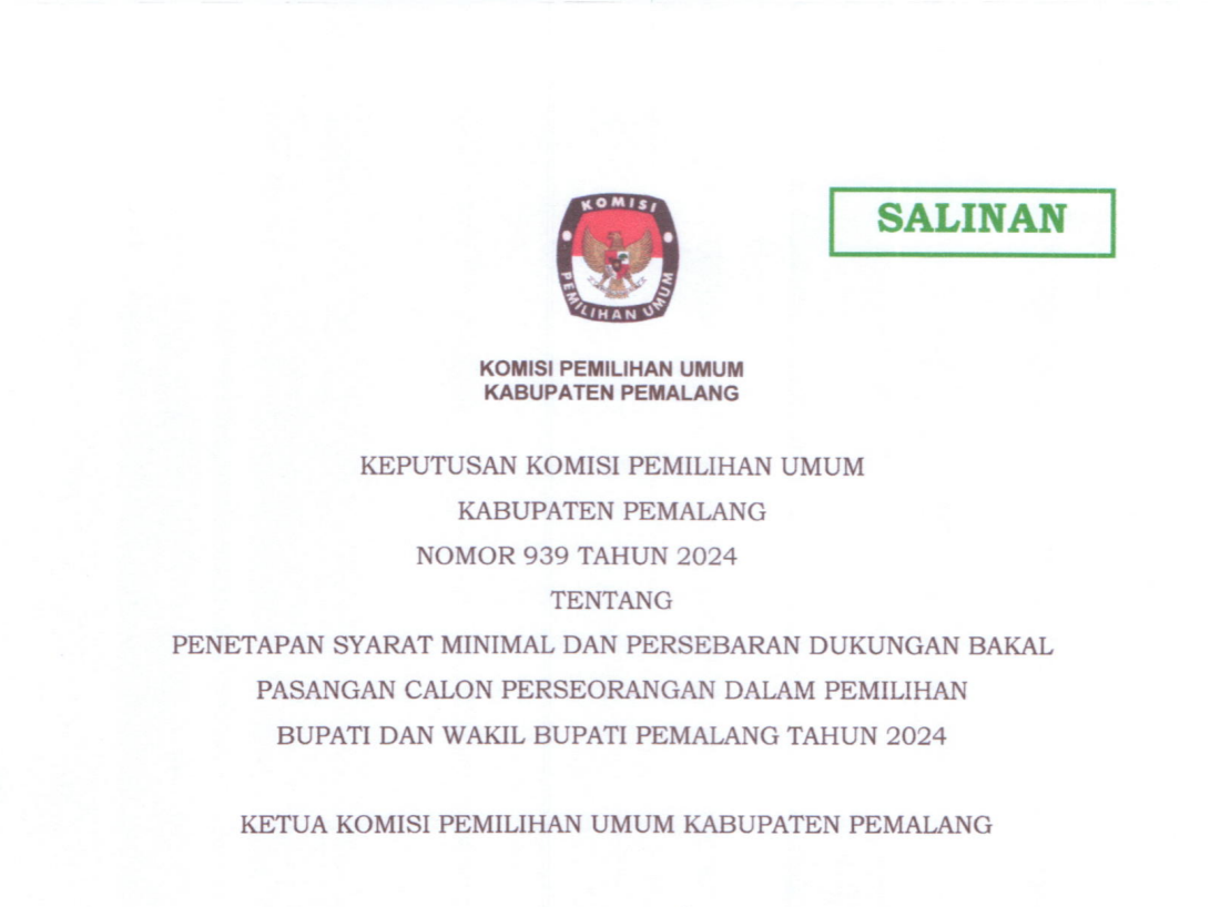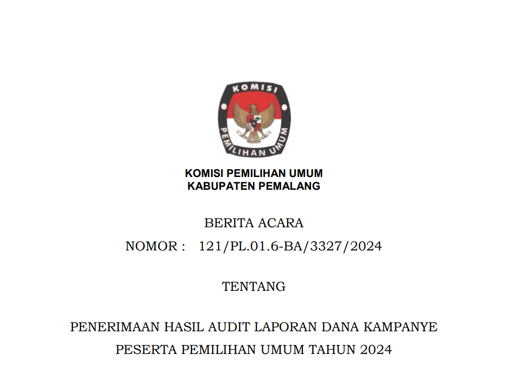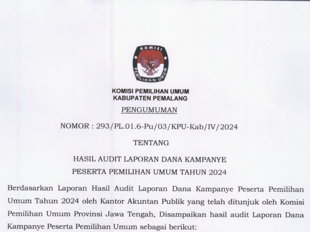 PENGUMUMAN NOMOR 293/PL.01.6-Pu/03/KPU-Kab/IV/2024 TENTANG HASIL AUDIT LAPORAN DANA KAMPANYE PESERTA PEMILIHAN UMUM TAHUN 2024 dapat diunduh disini
